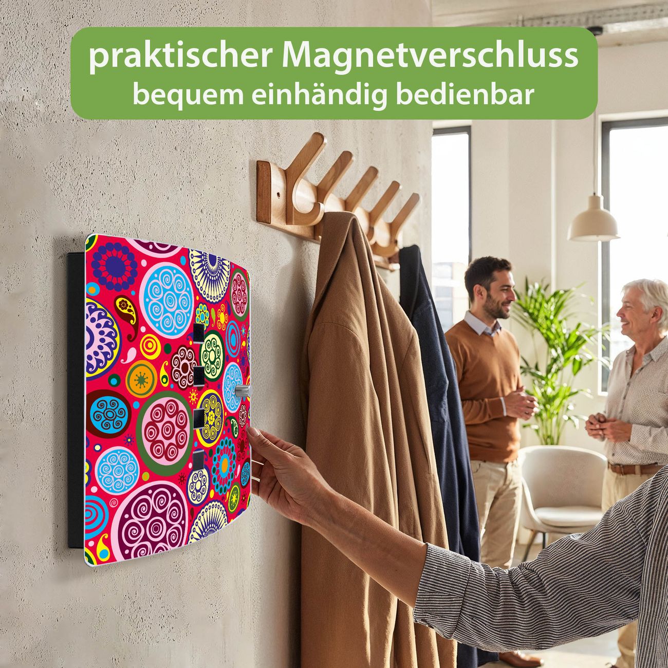 Funktion / Nutzen: Die leicht geschwungene Edelstahltür ist mit einer hochwertigen Motivfolie und dem Motiv Motiv Retro Kreise kaschiert. Ein praktischer Magnetverschluss ermöglicht Ihnen ein schnelles Öffnen und Schließen. Befestigt wird der Schlüsselkasten an 2 Stellen auf der Rückseite, passendes Montagematerial fügen wir bereits bei.