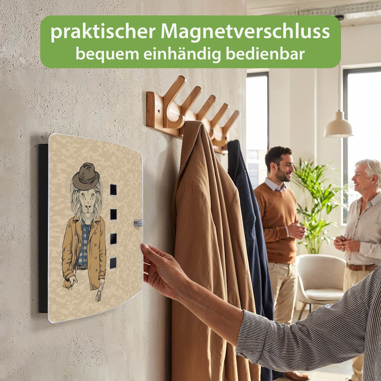 Funktion / Nutzen: Die leicht geschwungene Edelstahltür ist mit einer hochwertigen Motivfolie und dem Motiv Motiv Retro Style kaschiert. Ein praktischer Magnetverschluss ermöglicht Ihnen ein schnelles Öffnen und Schließen. Befestigt wird der Schlüsselkasten an 2 Stellen auf der Rückseite, passendes Montagematerial fügen wir bereits bei.