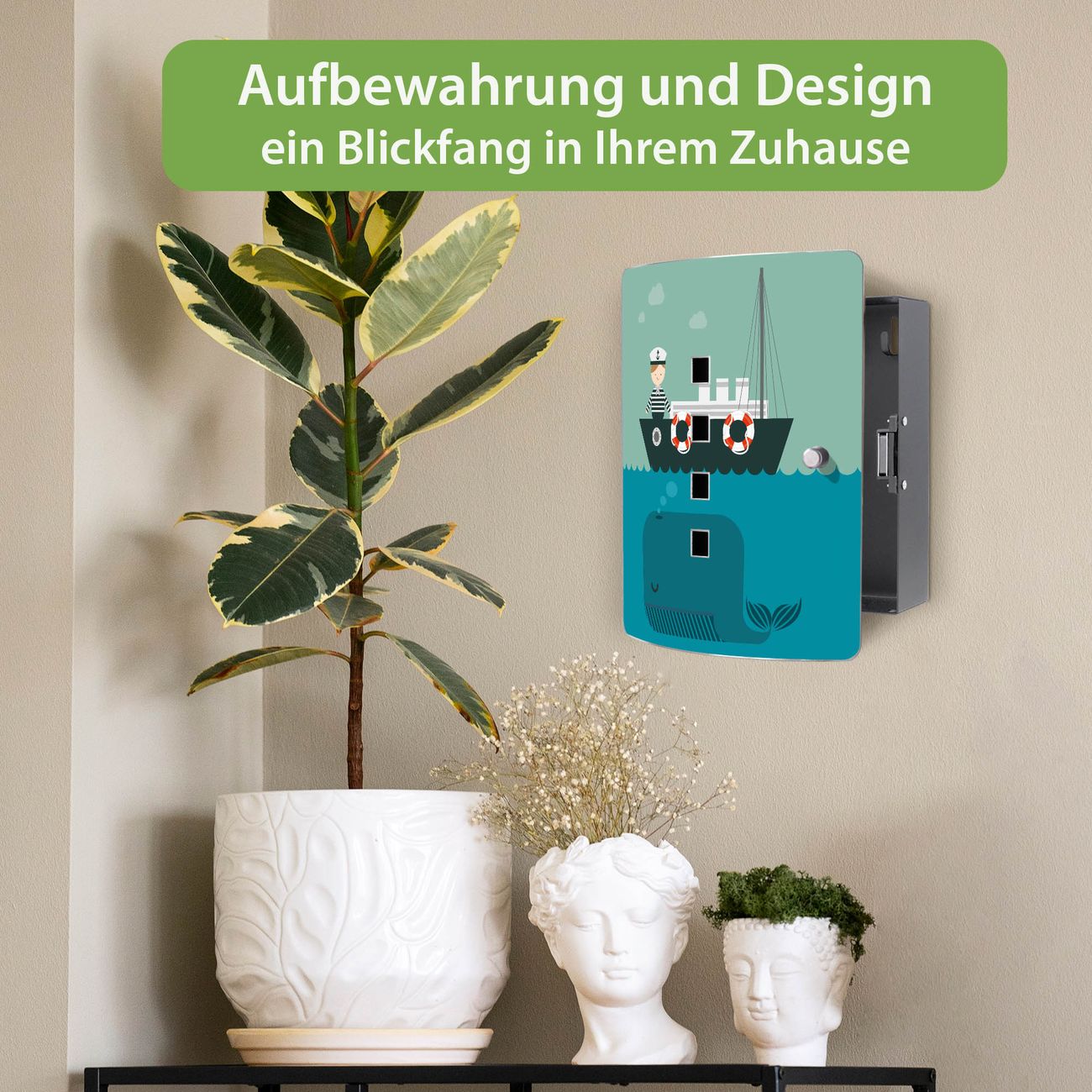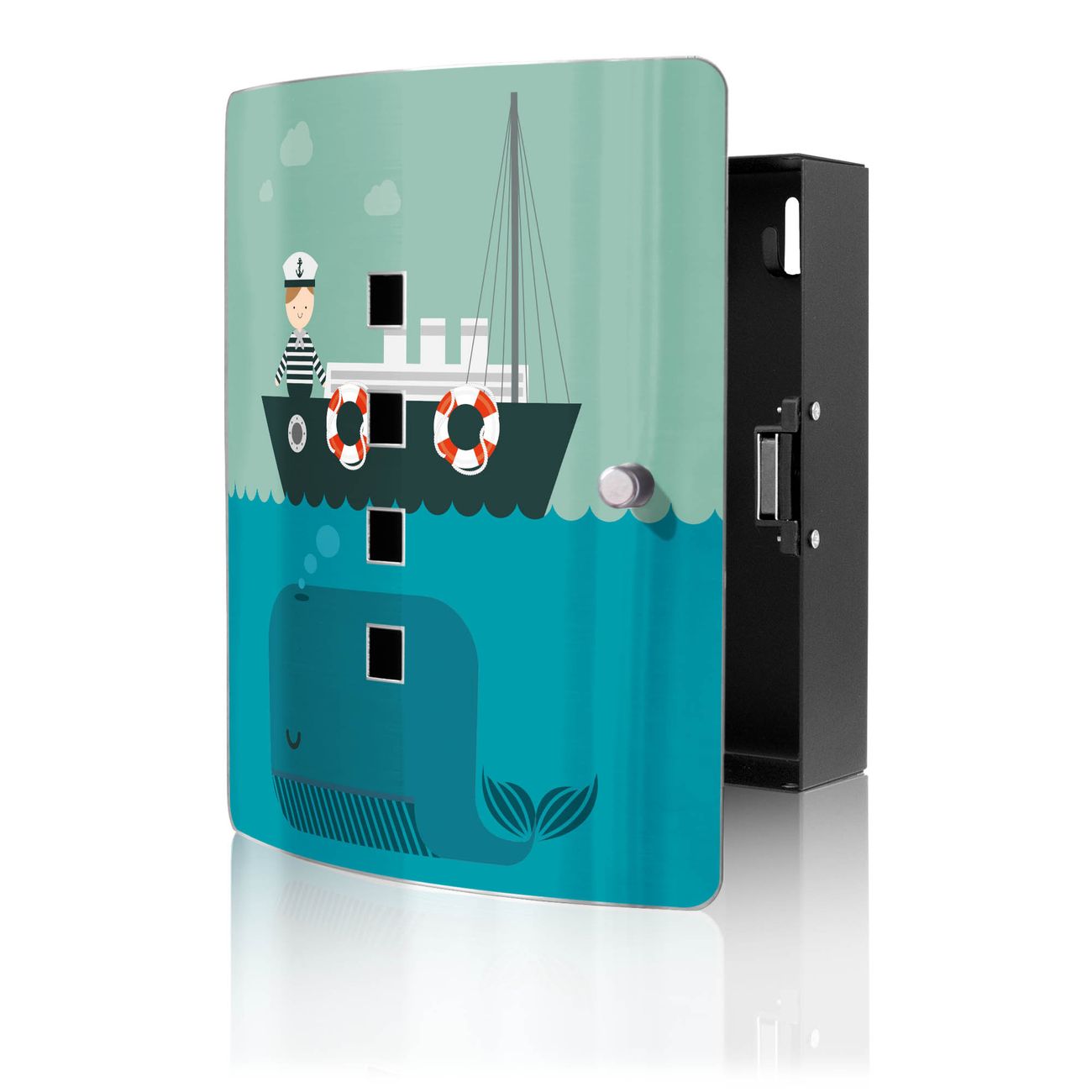 Funktion / Nutzen: Die leicht geschwungene Edelstahltür ist mit einer hochwertigen Motivfolie und dem Motiv Motiv Rettet die Wale kaschiert. Ein praktischer Magnetverschluss ermöglicht Ihnen ein schnelles Öffnen und Schließen. Befestigt wird der Schlüsselkasten an 2 Stellen auf der Rückseite, passendes Montagematerial fügen wir bereits bei.