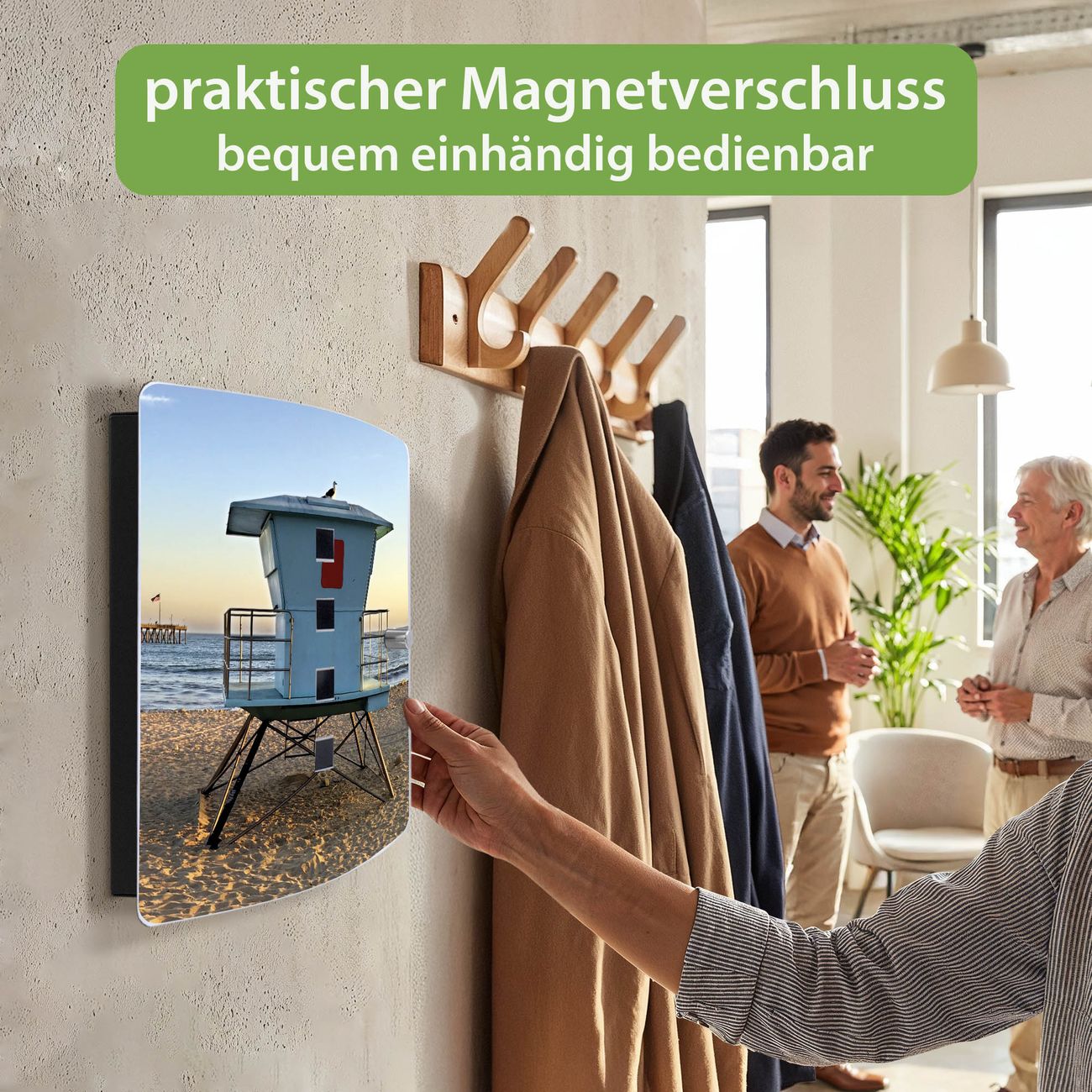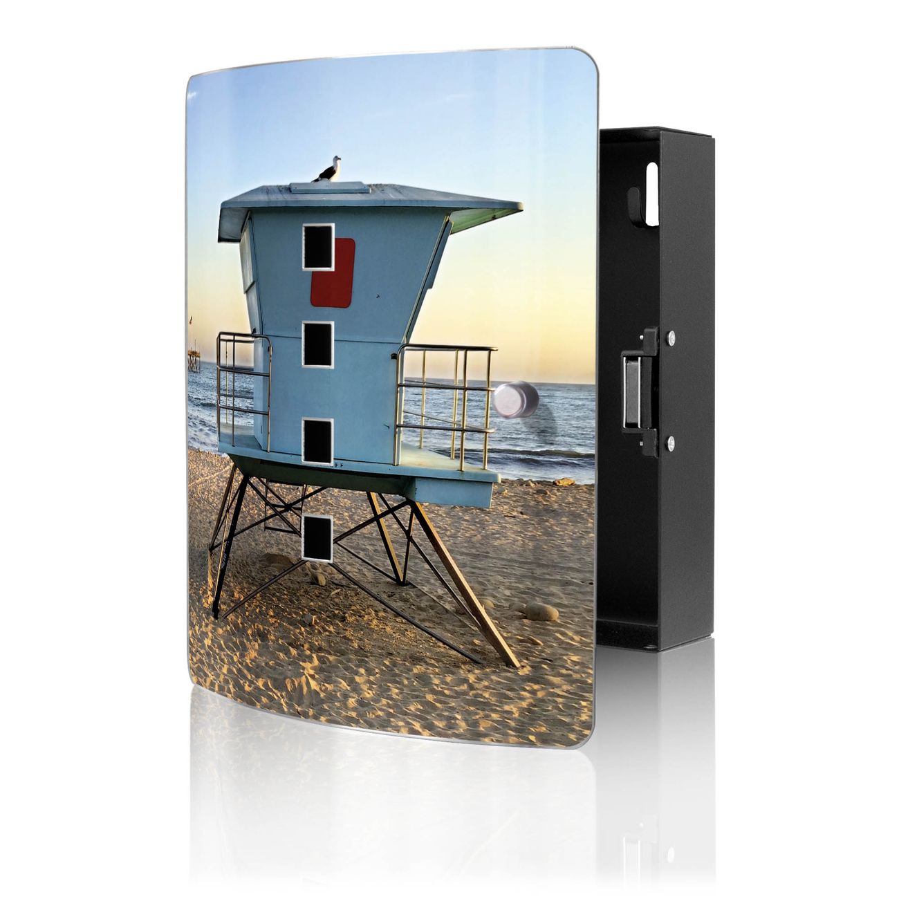 Funktion / Nutzen: Die leicht geschwungene Edelstahltür ist mit einer hochwertigen Motivfolie und dem Motiv Motiv Rettungsturm kaschiert. Ein praktischer Magnetverschluss ermöglicht Ihnen ein schnelles Öffnen und Schließen. Befestigt wird der Schlüsselkasten an 2 Stellen auf der Rückseite, passendes Montagematerial fügen wir bereits bei.