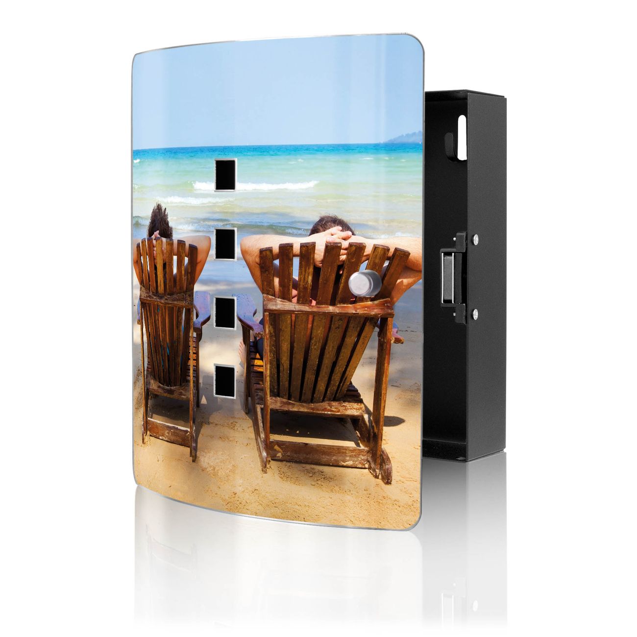 Funktion / Nutzen: Die leicht geschwungene Edelstahltür ist mit einer hochwertigen Motivfolie und dem Motiv Motiv Robinson Und Freitag kaschiert. Ein praktischer Magnetverschluss ermöglicht Ihnen ein schnelles Öffnen und Schließen. Befestigt wird der Schlüsselkasten an 2 Stellen auf der Rückseite, passendes Montagematerial fügen wir bereits bei.