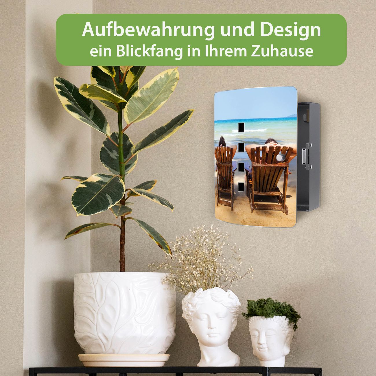 Der Schlüsselkasten ist gesamt 24x21x5cm groß und wiegt ca. 900g. Die Fronttür hat eine 90° Öffnung und besteht aus Edelstahl. Das Gehäuse ist zeitlos schwarz und aus Stahl gefertigt.