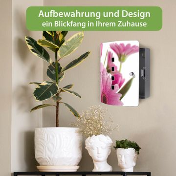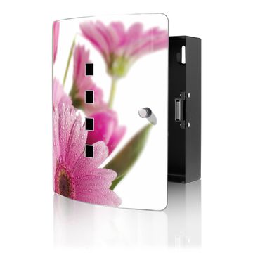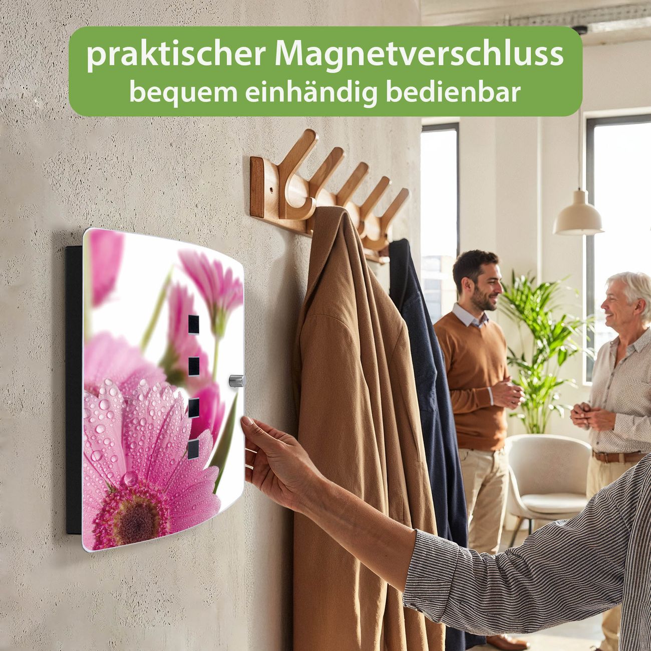 Funktion / Nutzen: Die leicht geschwungene Edelstahltür ist mit einer hochwertigen Motivfolie und dem Motiv Motiv Rosa Gerbera kaschiert. Ein praktischer Magnetverschluss ermöglicht Ihnen ein schnelles Öffnen und Schließen. Befestigt wird der Schlüsselkasten an 2 Stellen auf der Rückseite, passendes Montagematerial fügen wir bereits bei.