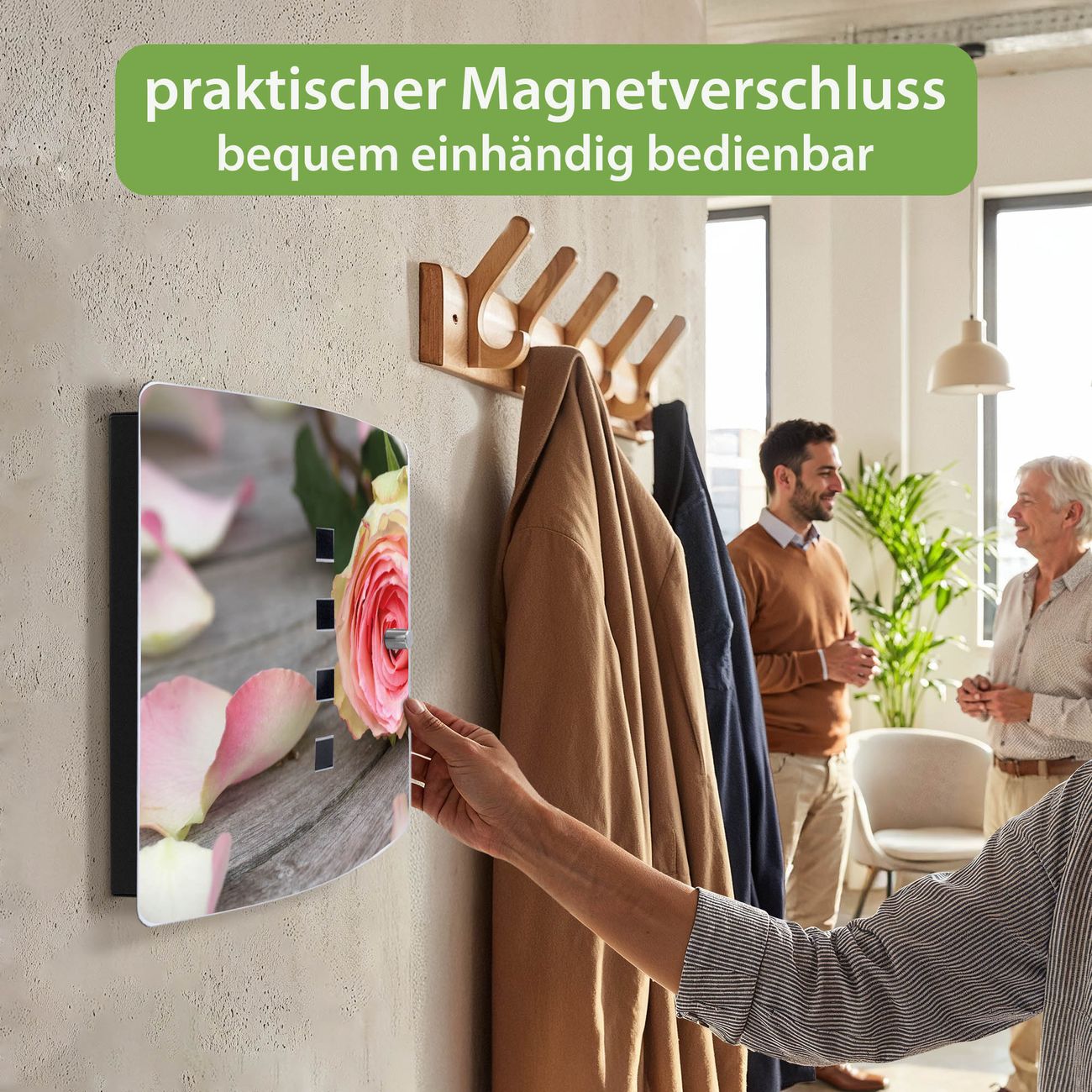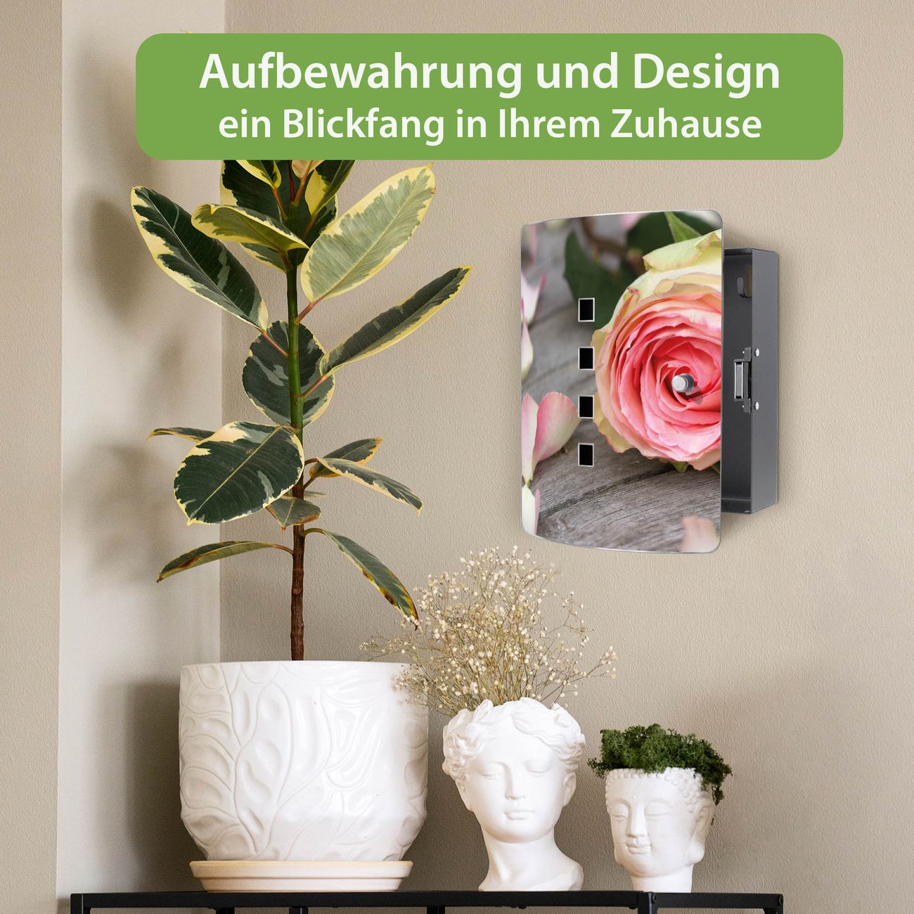 Funktion / Nutzen: Die leicht geschwungene Edelstahltür ist mit einer hochwertigen Motivfolie und dem Motiv Motiv Rosa Rose kaschiert. Ein praktischer Magnetverschluss ermöglicht Ihnen ein schnelles Öffnen und Schließen. Befestigt wird der Schlüsselkasten an 2 Stellen auf der Rückseite, passendes Montagematerial fügen wir bereits bei.