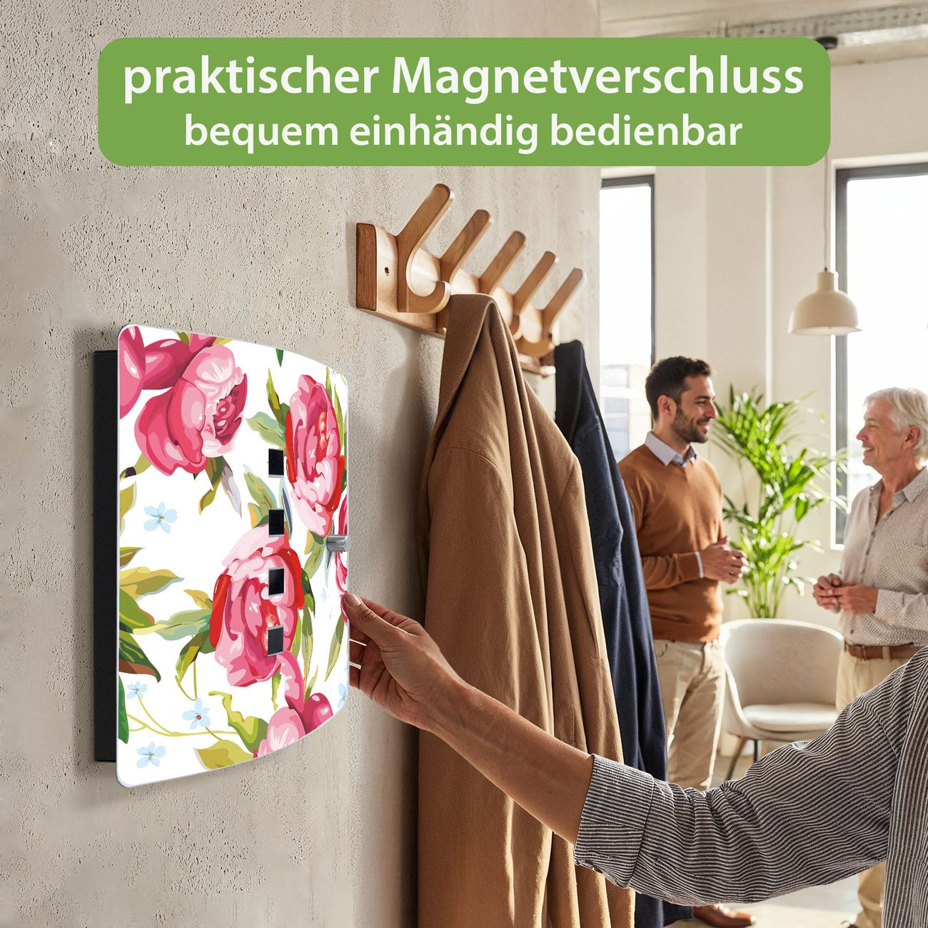 Funktion / Nutzen: Die leicht geschwungene Edelstahltür ist mit einer hochwertigen Motivfolie und dem Motiv Motiv Rosen Rustikal kaschiert. Ein praktischer Magnetverschluss ermöglicht Ihnen ein schnelles Öffnen und Schließen. Befestigt wird der Schlüsselkasten an 2 Stellen auf der Rückseite, passendes Montagematerial fügen wir bereits bei.
