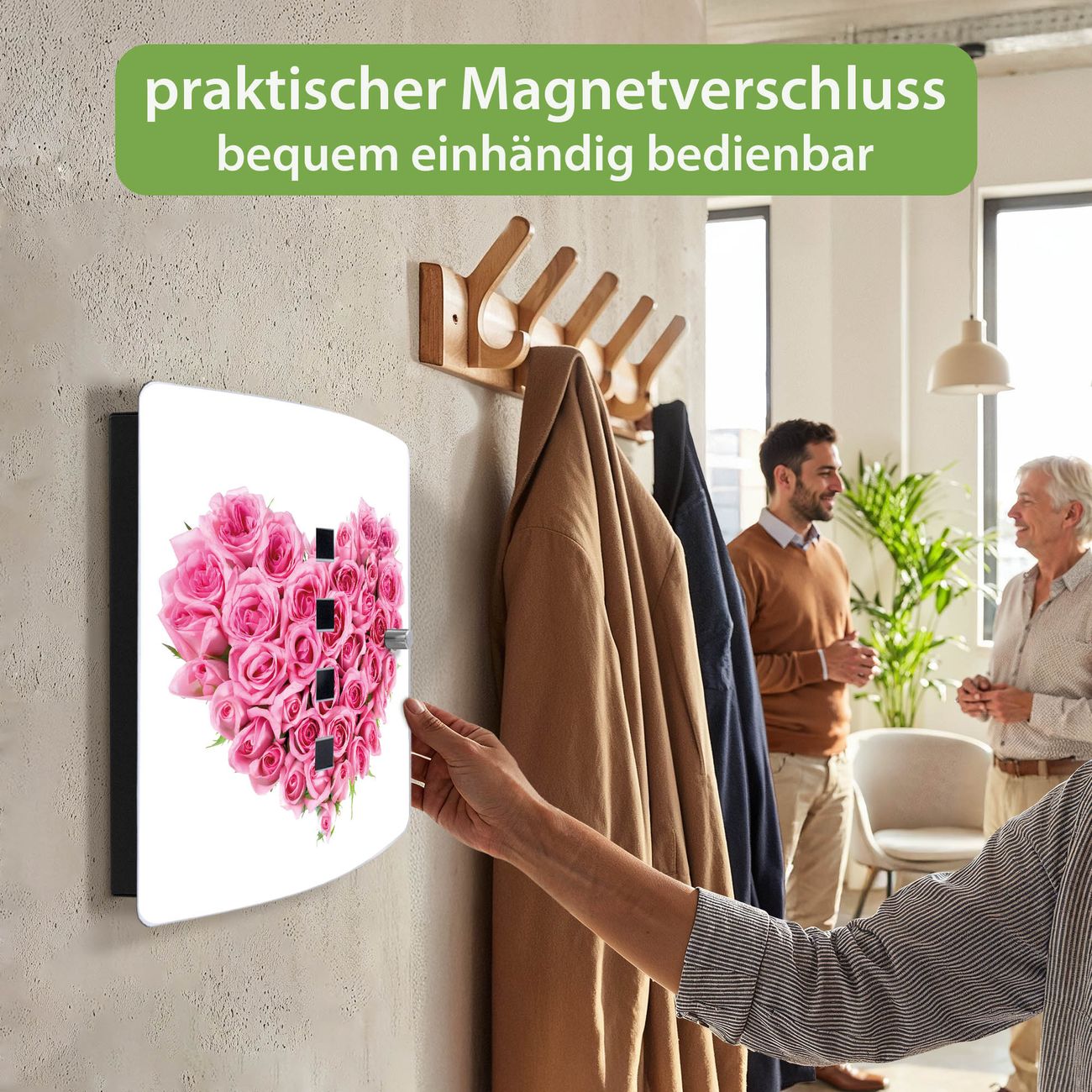 Funktion / Nutzen: Die leicht geschwungene Edelstahltür ist mit einer hochwertigen Motivfolie und dem Motiv Motiv Rosenherz kaschiert. Ein praktischer Magnetverschluss ermöglicht Ihnen ein schnelles Öffnen und Schließen. Befestigt wird der Schlüsselkasten an 2 Stellen auf der Rückseite, passendes Montagematerial fügen wir bereits bei.