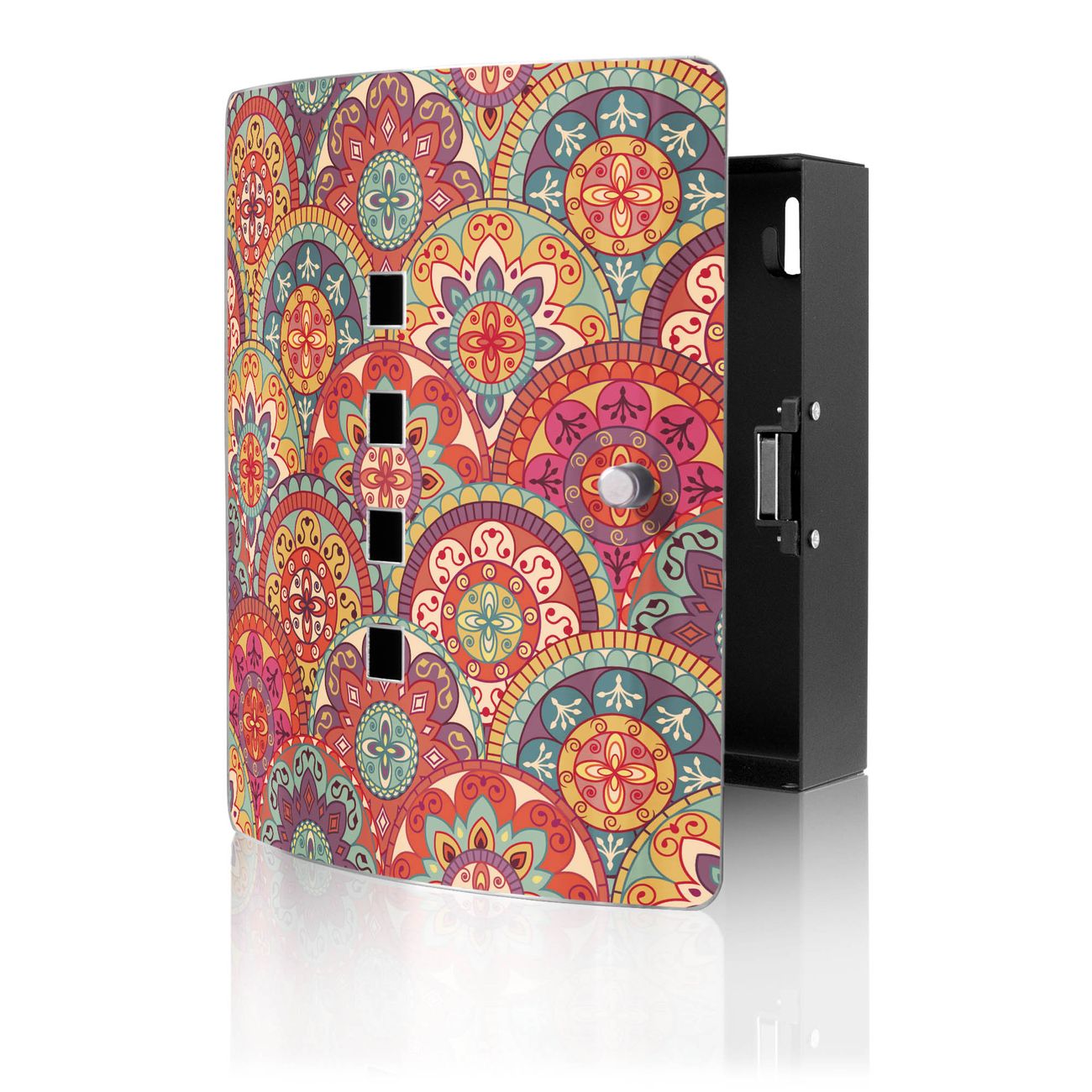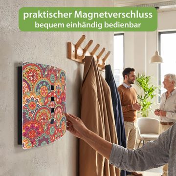 Funktion / Nutzen: Die leicht geschwungene Edelstahltür ist mit einer hochwertigen Motivfolie und dem Motiv Motiv Rosetten kaschiert. Ein praktischer Magnetverschluss ermöglicht Ihnen ein schnelles Öffnen und Schließen. Befestigt wird der Schlüsselkasten an 2 Stellen auf der Rückseite, passendes Montagematerial fügen wir bereits bei.