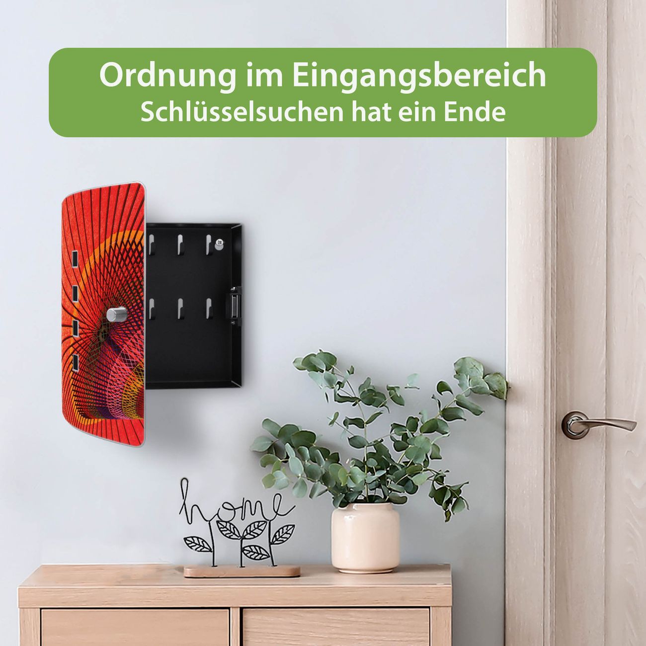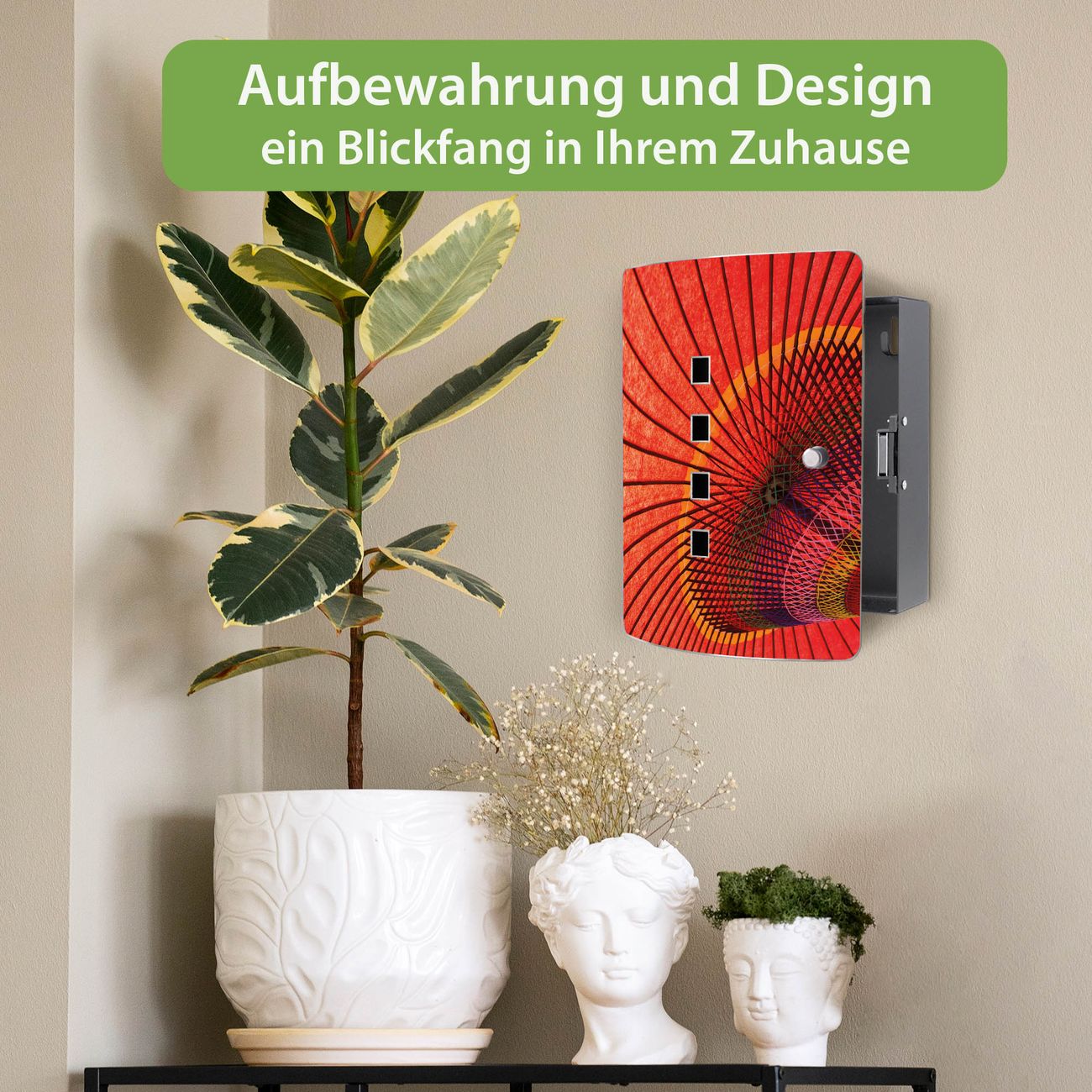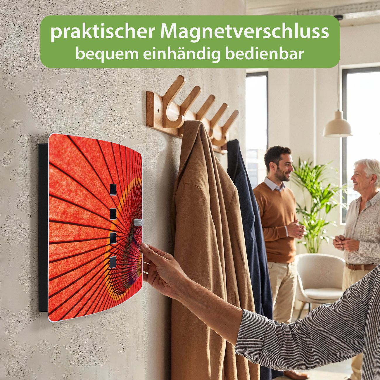 Funktion / Nutzen: Die leicht geschwungene Edelstahltür ist mit einer hochwertigen Motivfolie und dem Motiv Motiv Roter Schirm kaschiert. Ein praktischer Magnetverschluss ermöglicht Ihnen ein schnelles Öffnen und Schließen. Befestigt wird der Schlüsselkasten an 2 Stellen auf der Rückseite, passendes Montagematerial fügen wir bereits bei.
