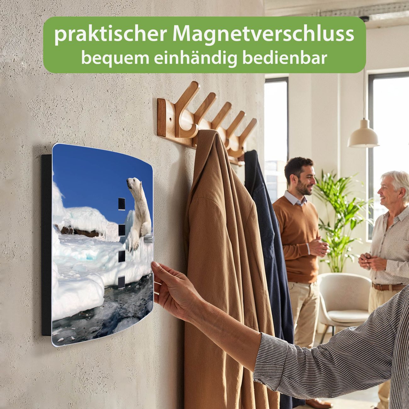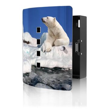 Funktion / Nutzen: Die leicht geschwungene Edelstahltür ist mit einer hochwertigen Motivfolie und dem Motiv Motiv Ruhender Eisbär kaschiert. Ein praktischer Magnetverschluss ermöglicht Ihnen ein schnelles Öffnen und Schließen. Befestigt wird der Schlüsselkasten an 2 Stellen auf der Rückseite, passendes Montagematerial fügen wir bereits bei.