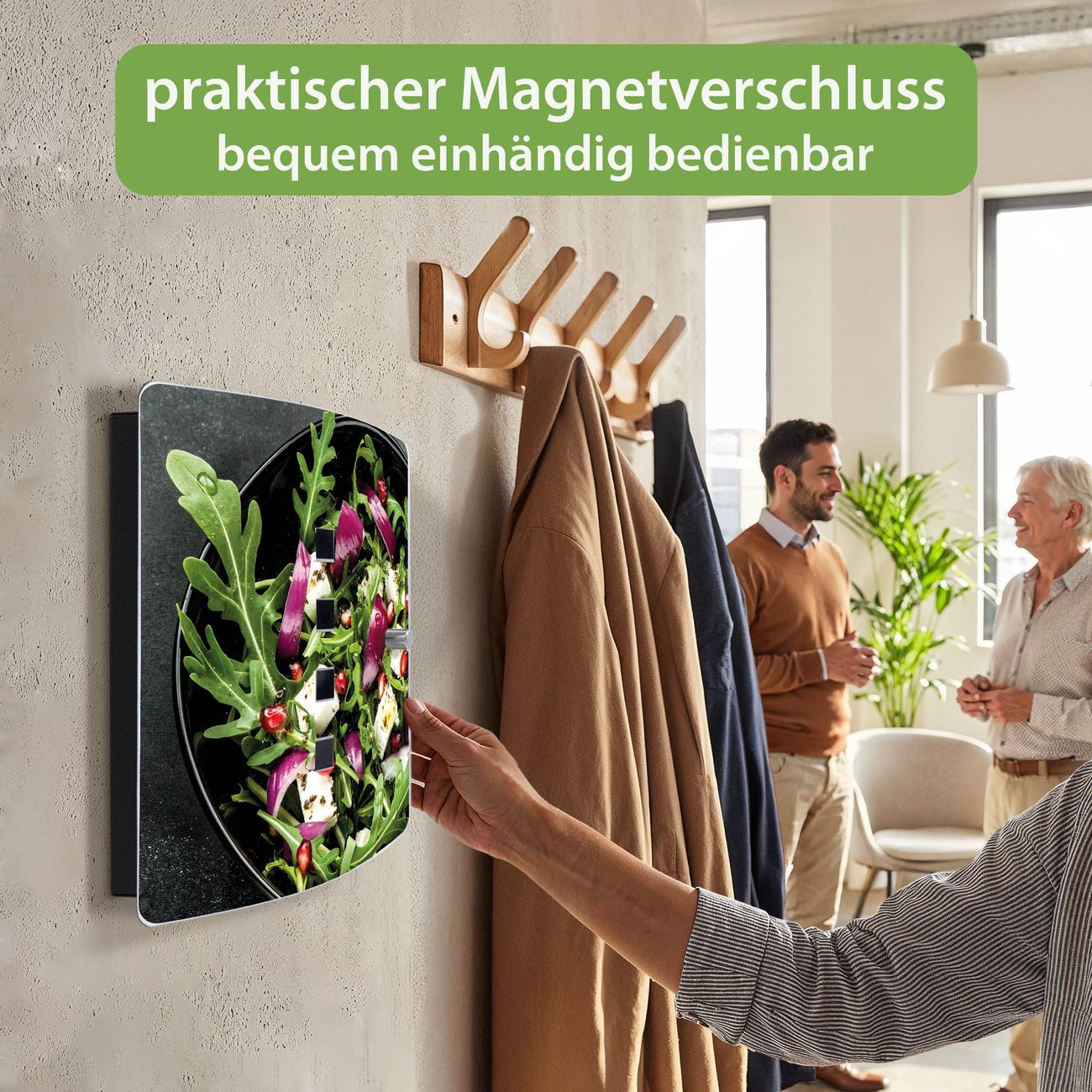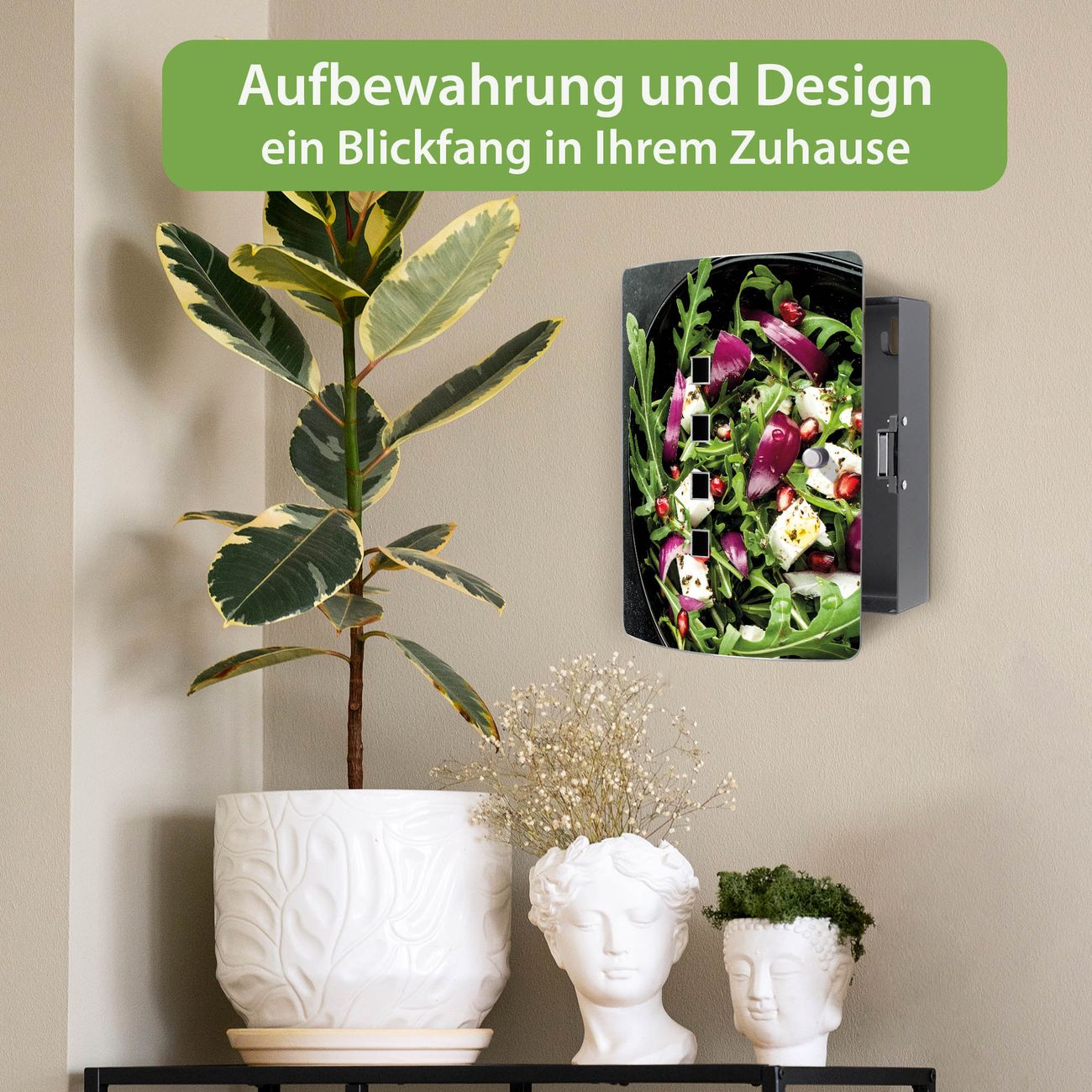 Funktion / Nutzen: Die leicht geschwungene Edelstahltür ist mit einer hochwertigen Motivfolie und dem Motiv Motiv Salat kaschiert. Ein praktischer Magnetverschluss ermöglicht Ihnen ein schnelles Öffnen und Schließen. Befestigt wird der Schlüsselkasten an 2 Stellen auf der Rückseite, passendes Montagematerial fügen wir bereits bei.