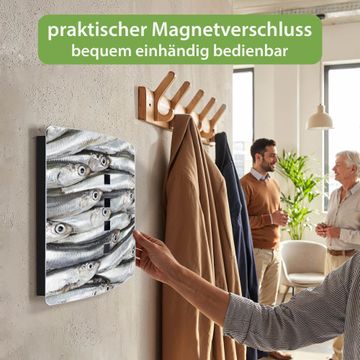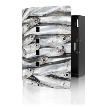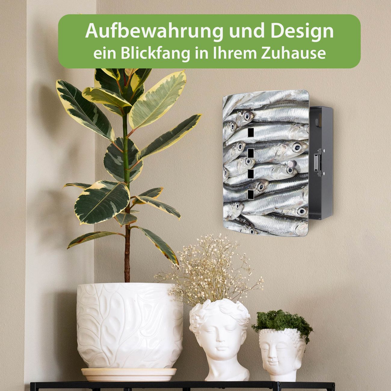 Funktion / Nutzen: Die leicht geschwungene Edelstahltür ist mit einer hochwertigen Motivfolie und dem Motiv Motiv Sardinen kaschiert. Ein praktischer Magnetverschluss ermöglicht Ihnen ein schnelles Öffnen und Schließen. Befestigt wird der Schlüsselkasten an 2 Stellen auf der Rückseite, passendes Montagematerial fügen wir bereits bei.