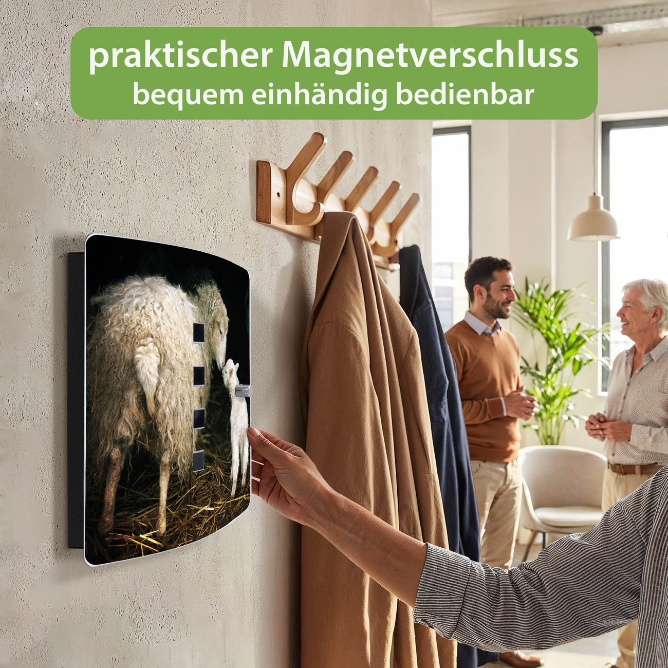 Funktion / Nutzen: Die leicht geschwungene Edelstahltür ist mit einer hochwertigen Motivfolie und dem Motiv Motiv Schaf Und Lamm kaschiert. Ein praktischer Magnetverschluss ermöglicht Ihnen ein schnelles Öffnen und Schließen. Befestigt wird der Schlüsselkasten an 2 Stellen auf der Rückseite, passendes Montagematerial fügen wir bereits bei.