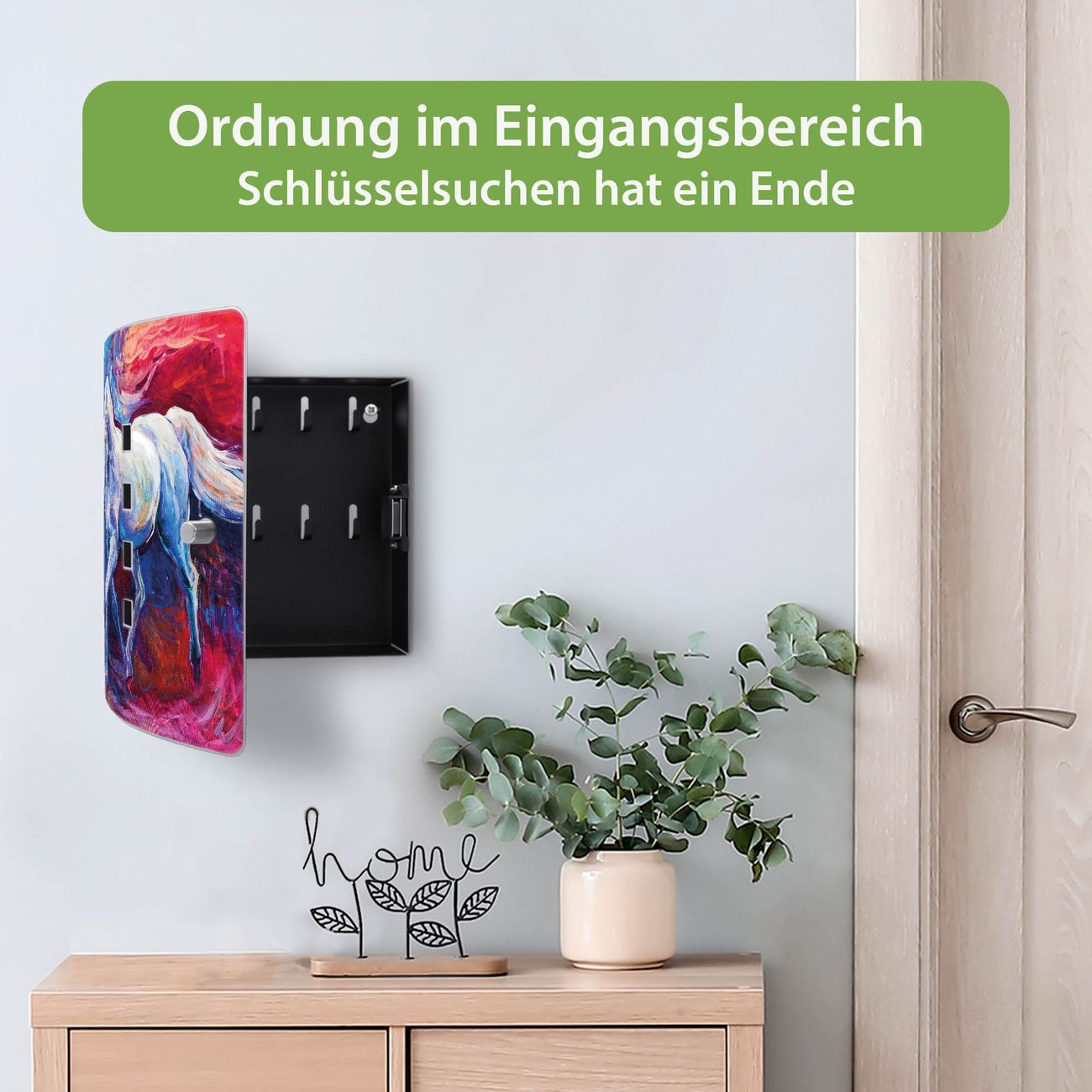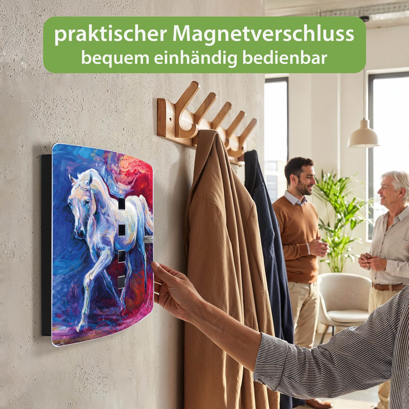 Funktion / Nutzen: Die leicht geschwungene Edelstahltür ist mit einer hochwertigen Motivfolie und dem Motiv Motiv Schimmel kaschiert. Ein praktischer Magnetverschluss ermöglicht Ihnen ein schnelles Öffnen und Schließen. Befestigt wird der Schlüsselkasten an 2 Stellen auf der Rückseite, passendes Montagematerial fügen wir bereits bei.