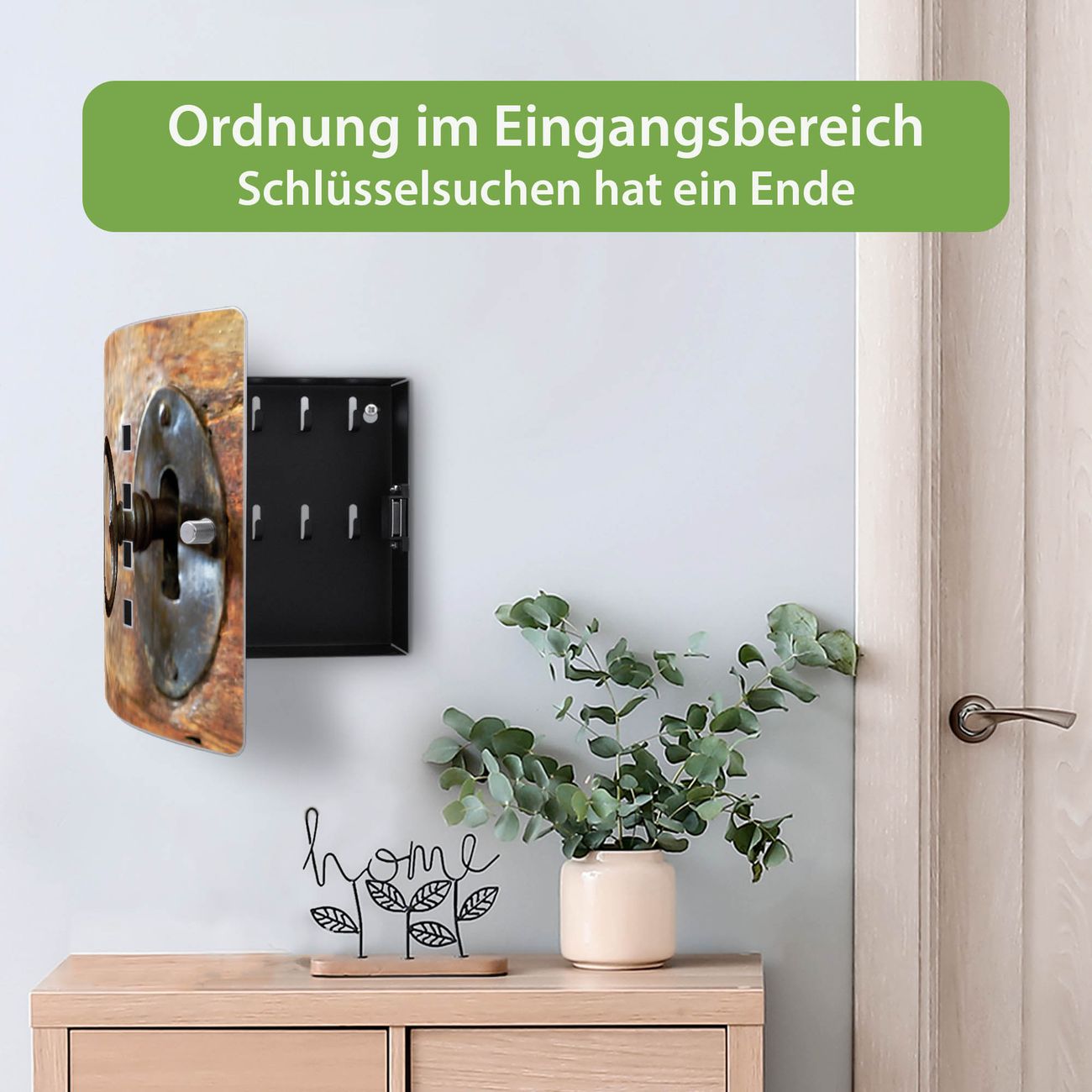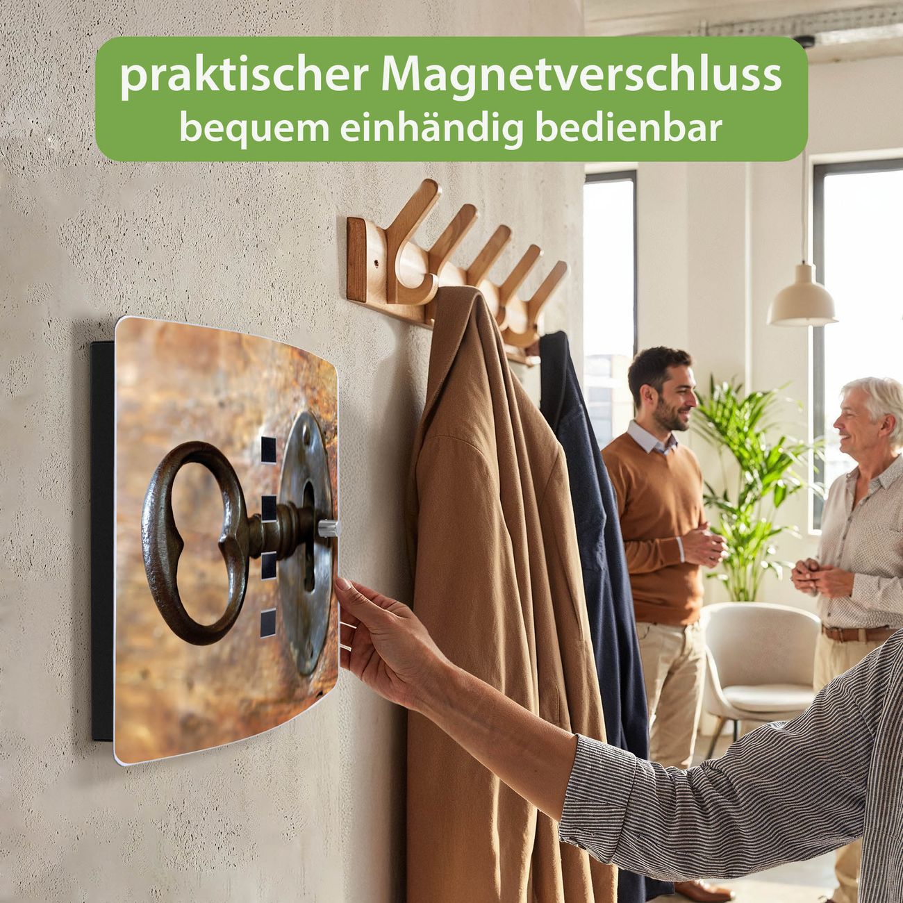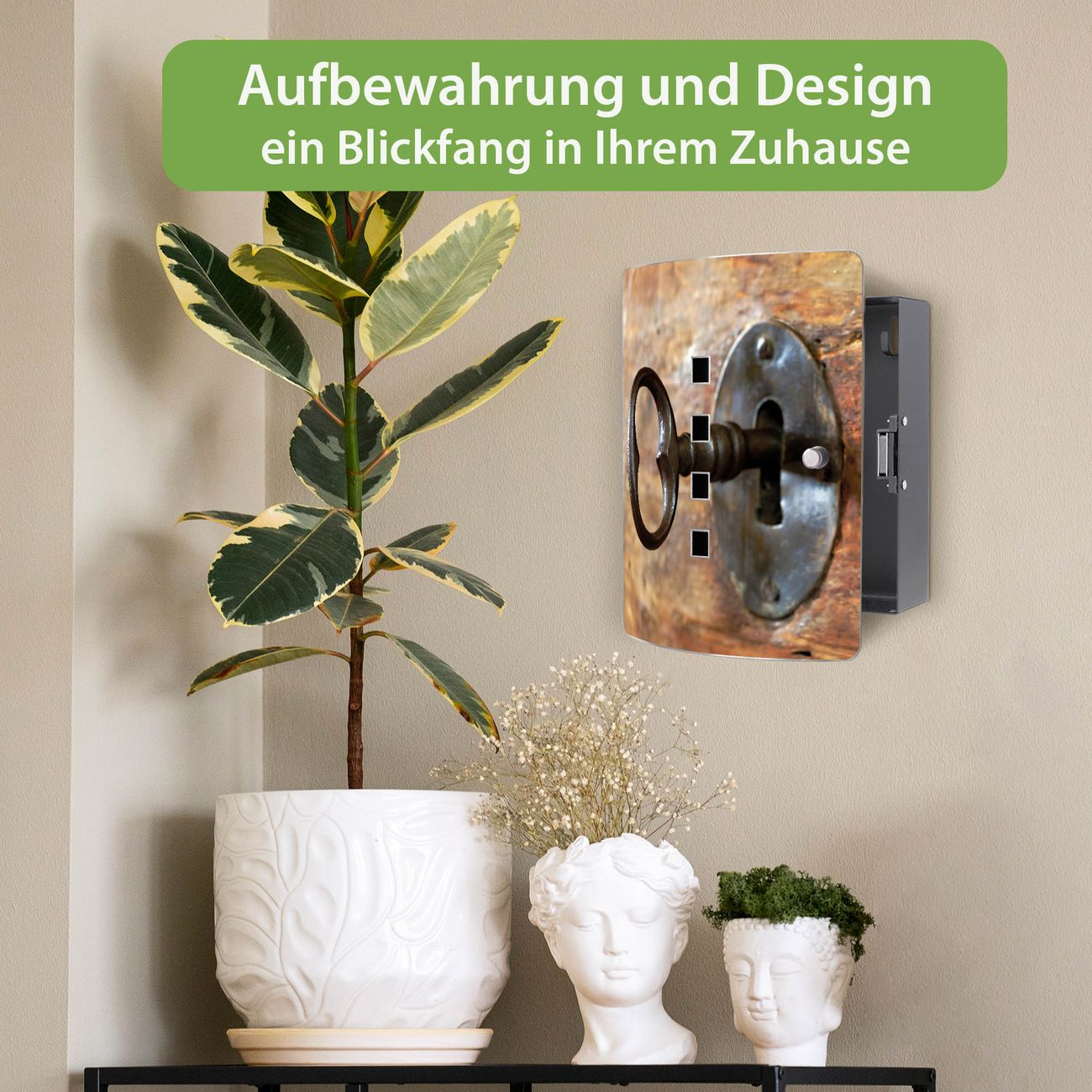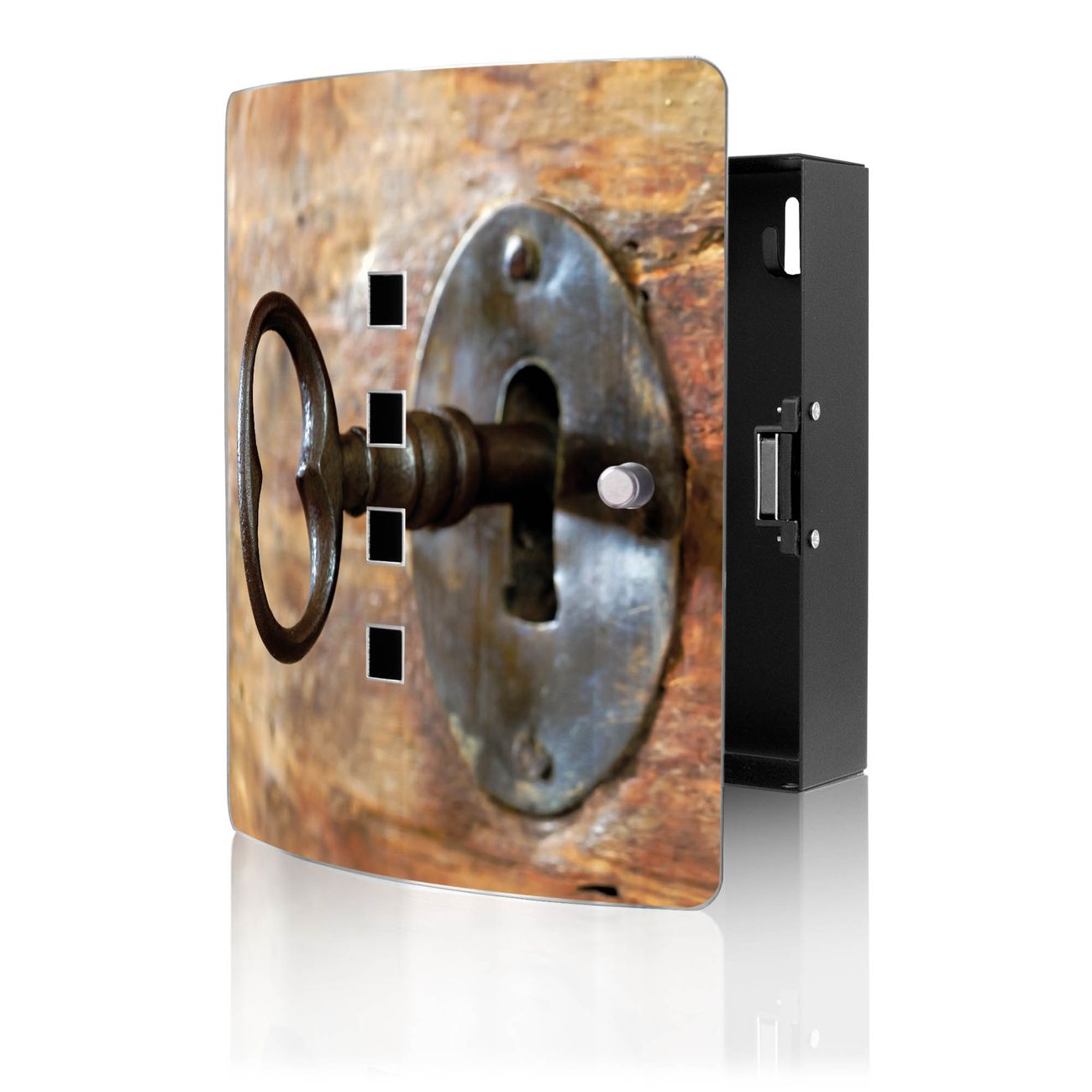 Funktion / Nutzen: Die leicht geschwungene Edelstahltür ist mit einer hochwertigen Motivfolie und dem Motiv Motiv Schlüssel kaschiert. Ein praktischer Magnetverschluss ermöglicht Ihnen ein schnelles Öffnen und Schließen. Befestigt wird der Schlüsselkasten an 2 Stellen auf der Rückseite, passendes Montagematerial fügen wir bereits bei.