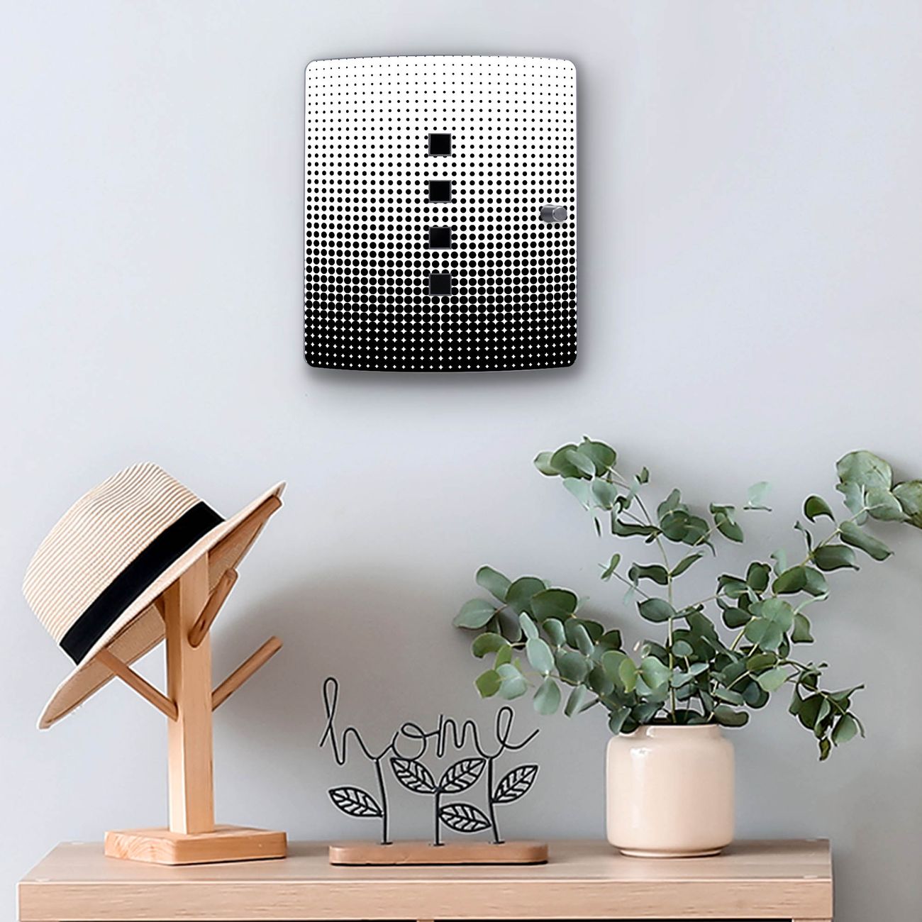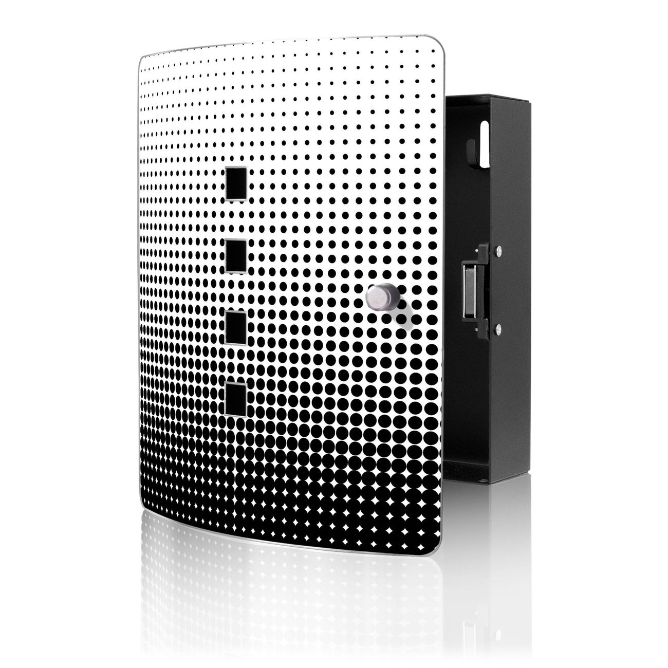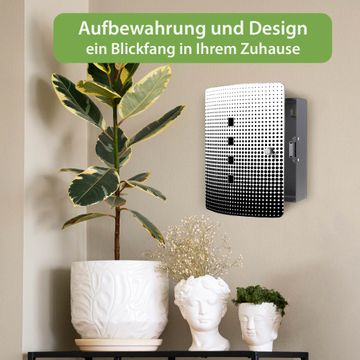 Funktion / Nutzen: Die leicht geschwungene Edelstahltür ist mit einer hochwertigen Motivfolie und dem Motiv Motiv Schwarz Weiß kaschiert. Ein praktischer Magnetverschluss ermöglicht Ihnen ein schnelles Öffnen und Schließen. Befestigt wird der Schlüsselkasten an 2 Stellen auf der Rückseite, passendes Montagematerial fügen wir bereits bei.