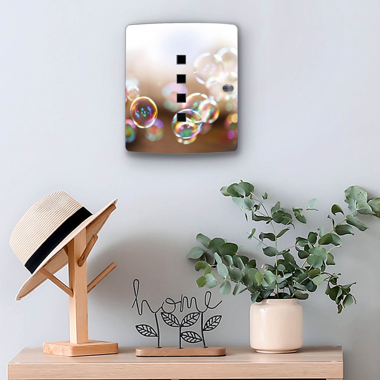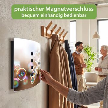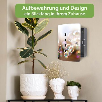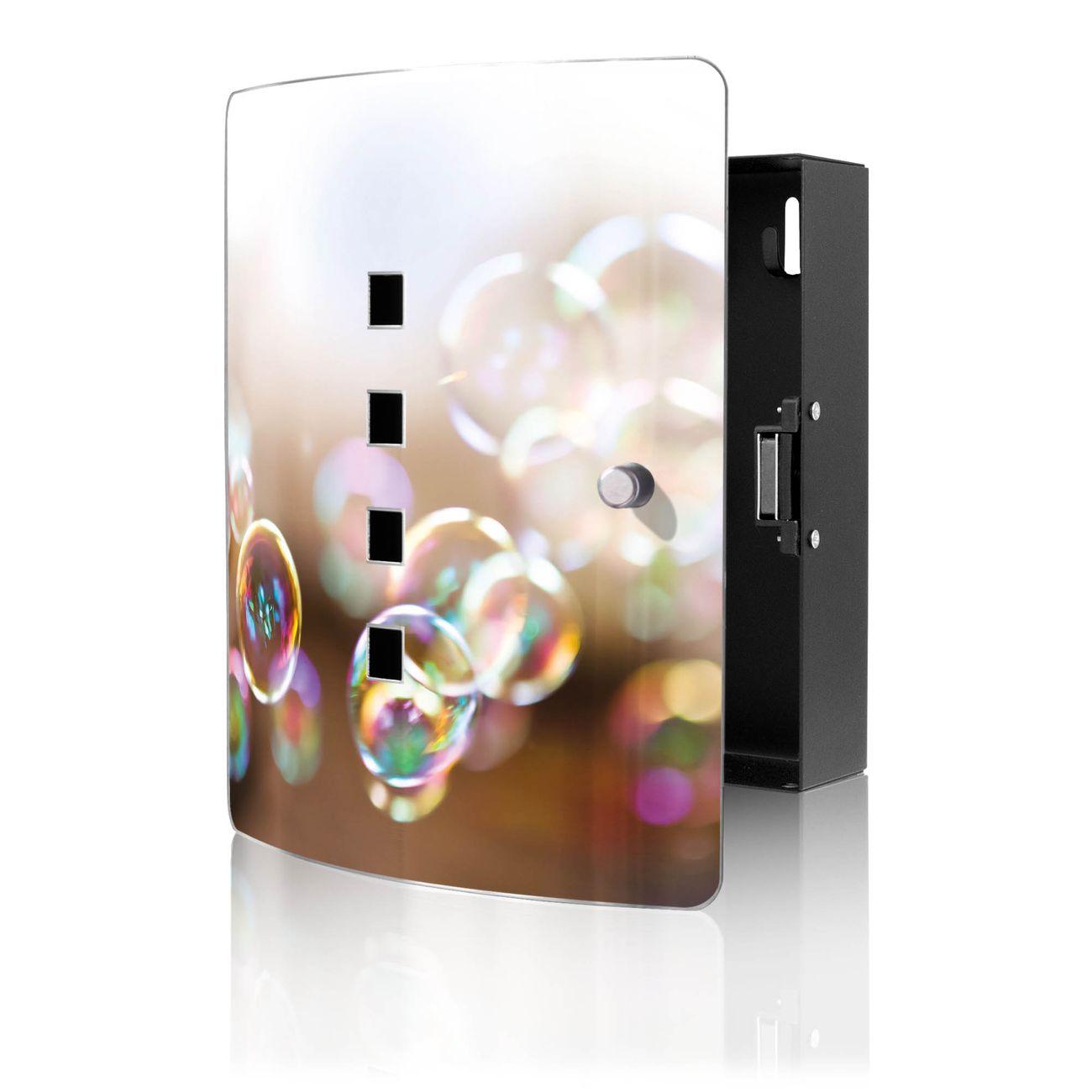 Funktion / Nutzen: Die leicht geschwungene Edelstahltür ist mit einer hochwertigen Motivfolie und dem Motiv Motiv Seifenblasen kaschiert. Ein praktischer Magnetverschluss ermöglicht Ihnen ein schnelles Öffnen und Schließen. Befestigt wird der Schlüsselkasten an 2 Stellen auf der Rückseite, passendes Montagematerial fügen wir bereits bei.