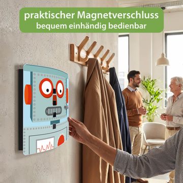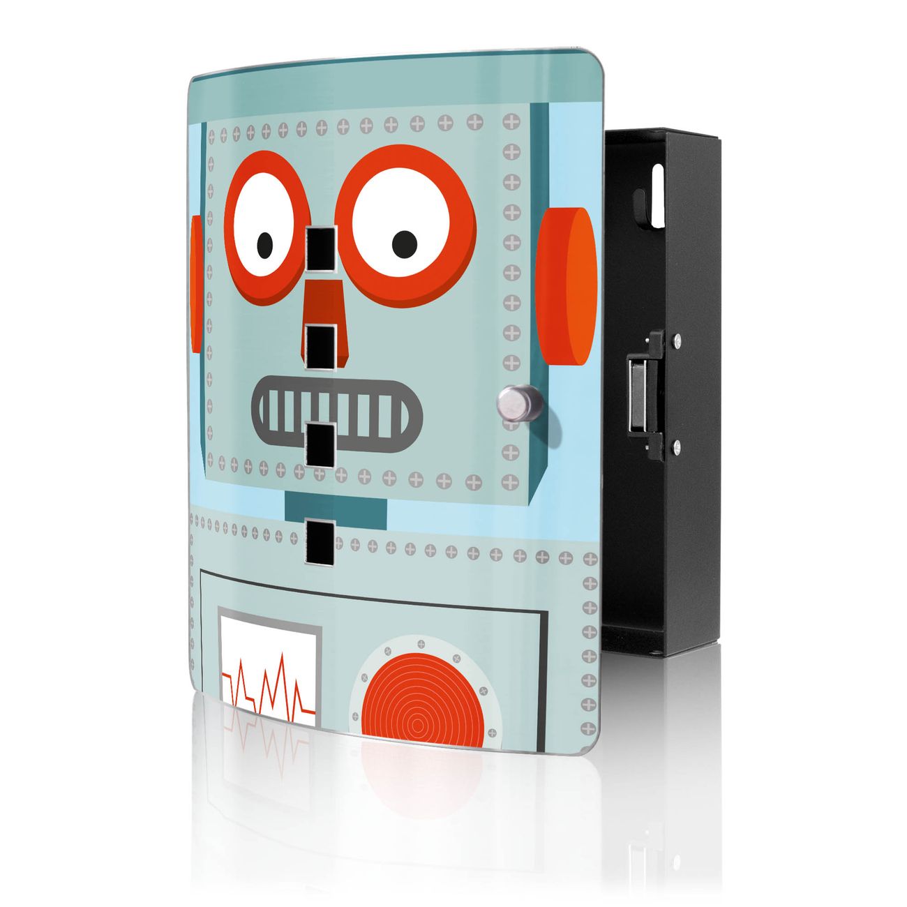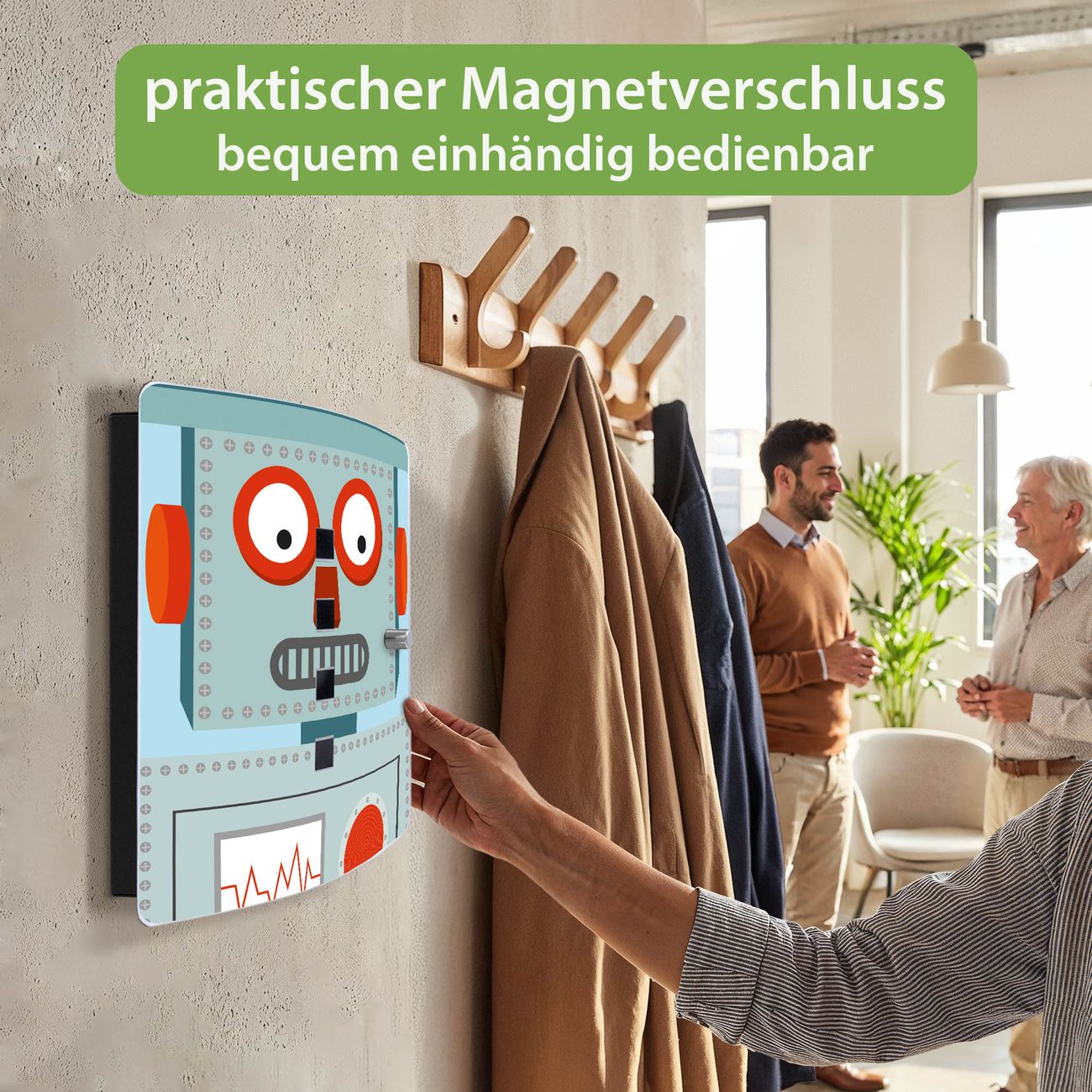 Funktion / Nutzen: Die leicht geschwungene Edelstahltür ist mit einer hochwertigen Motivfolie und dem Motiv Motiv Shocked Robot kaschiert. Ein praktischer Magnetverschluss ermöglicht Ihnen ein schnelles Öffnen und Schließen. Befestigt wird der Schlüsselkasten an 2 Stellen auf der Rückseite, passendes Montagematerial fügen wir bereits bei.