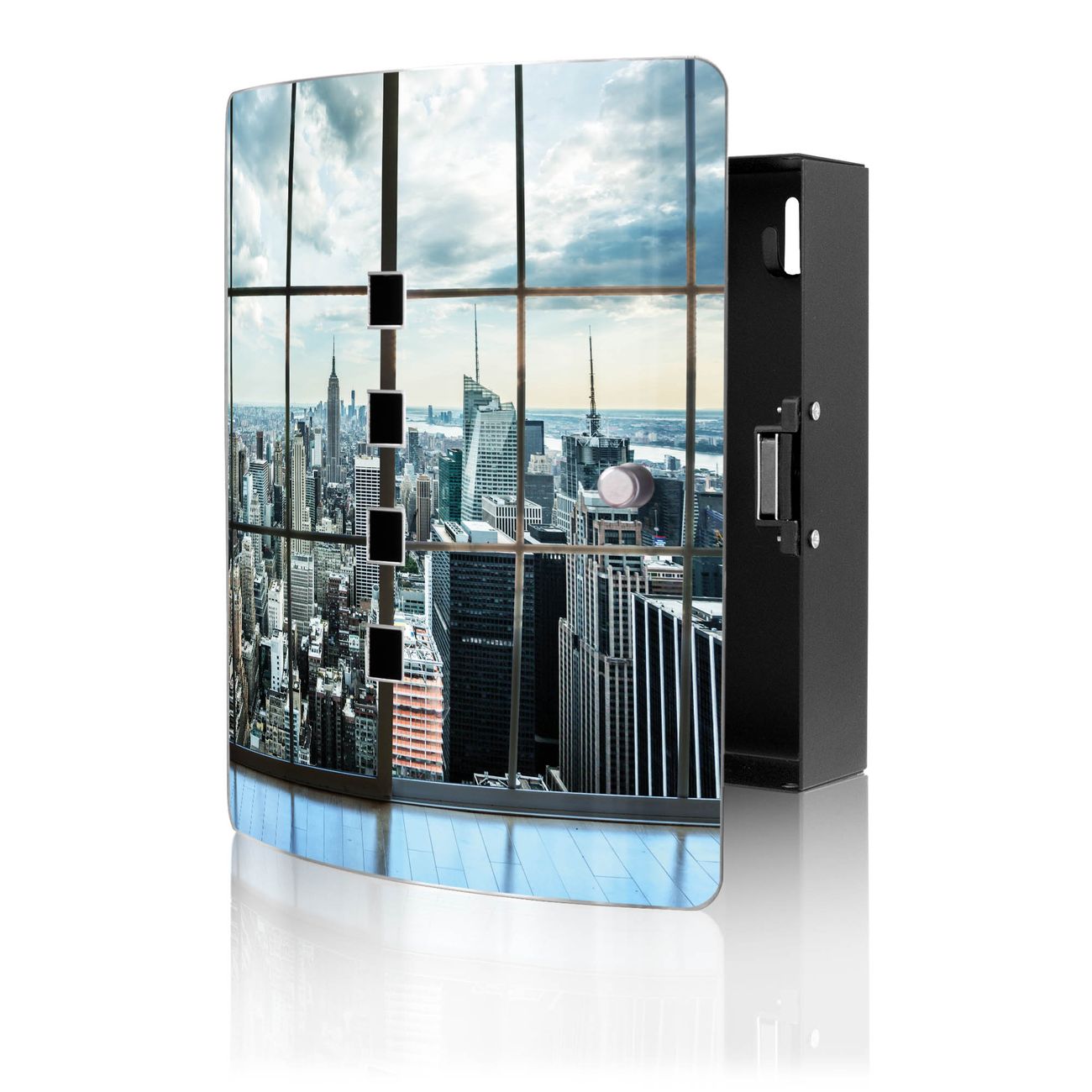 Funktion / Nutzen: Die leicht geschwungene Edelstahltür ist mit einer hochwertigen Motivfolie und dem Motiv Motiv Skyline Manhattan kaschiert. Ein praktischer Magnetverschluss ermöglicht Ihnen ein schnelles Öffnen und Schließen. Befestigt wird der Schlüsselkasten an 2 Stellen auf der Rückseite, passendes Montagematerial fügen wir bereits bei.