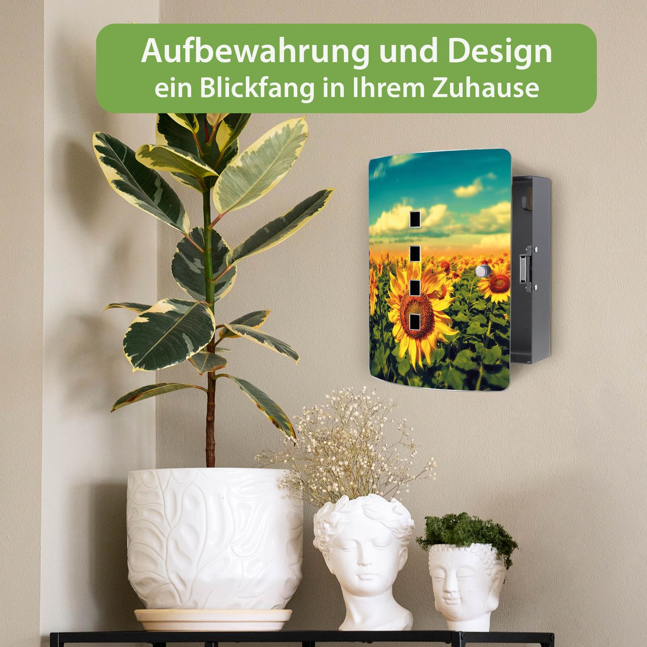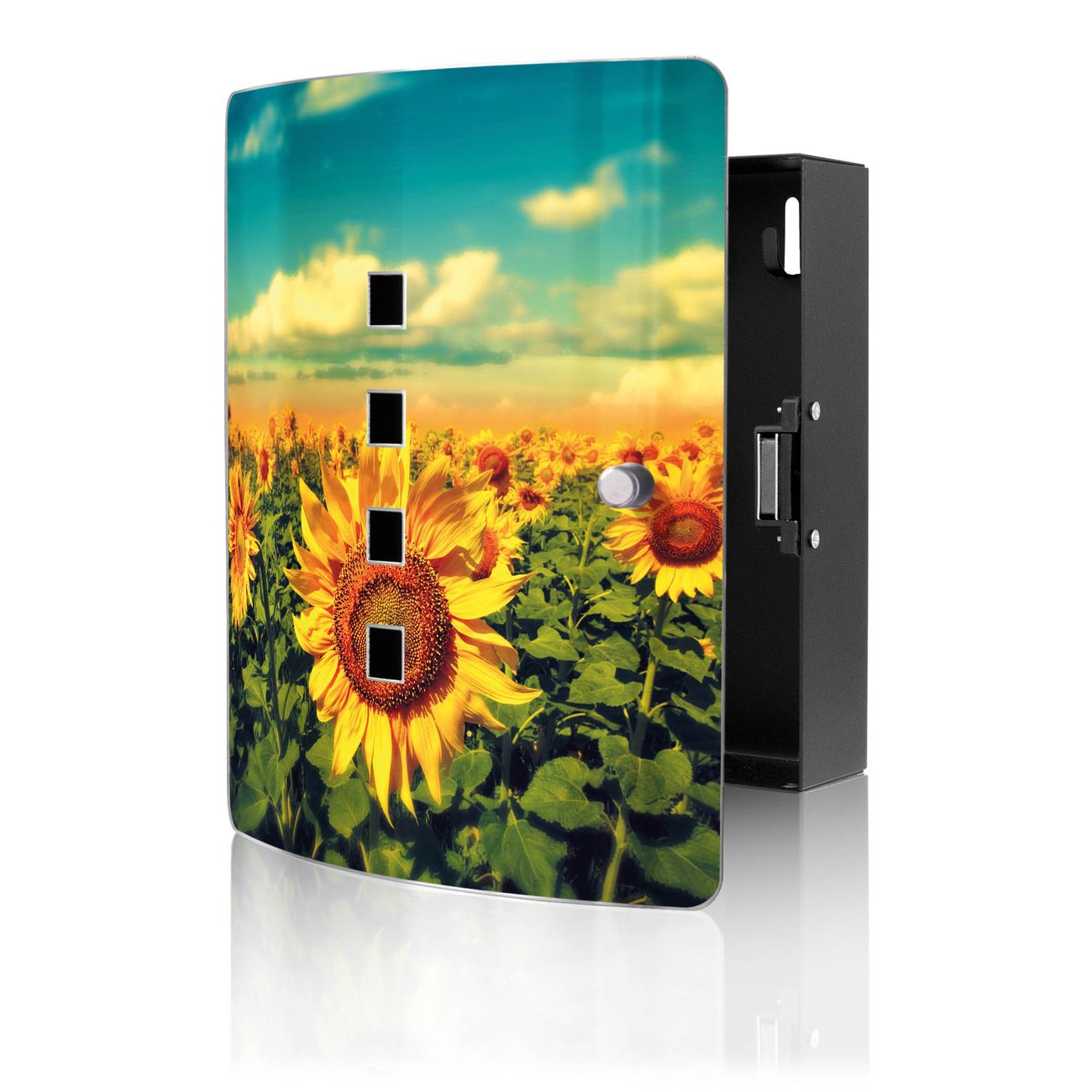 Funktion / Nutzen: Die leicht geschwungene Edelstahltür ist mit einer hochwertigen Motivfolie und dem Motiv Motiv Sonnenblumen kaschiert. Ein praktischer Magnetverschluss ermöglicht Ihnen ein schnelles Öffnen und Schließen. Befestigt wird der Schlüsselkasten an 2 Stellen auf der Rückseite, passendes Montagematerial fügen wir bereits bei.