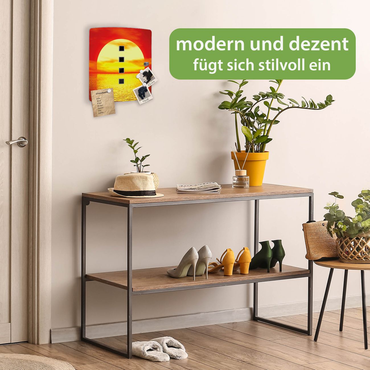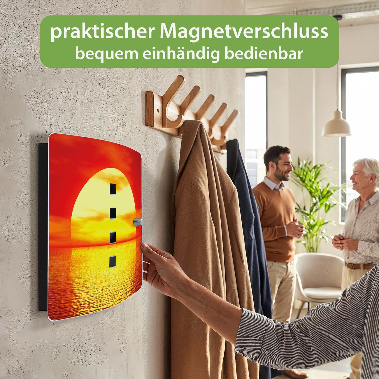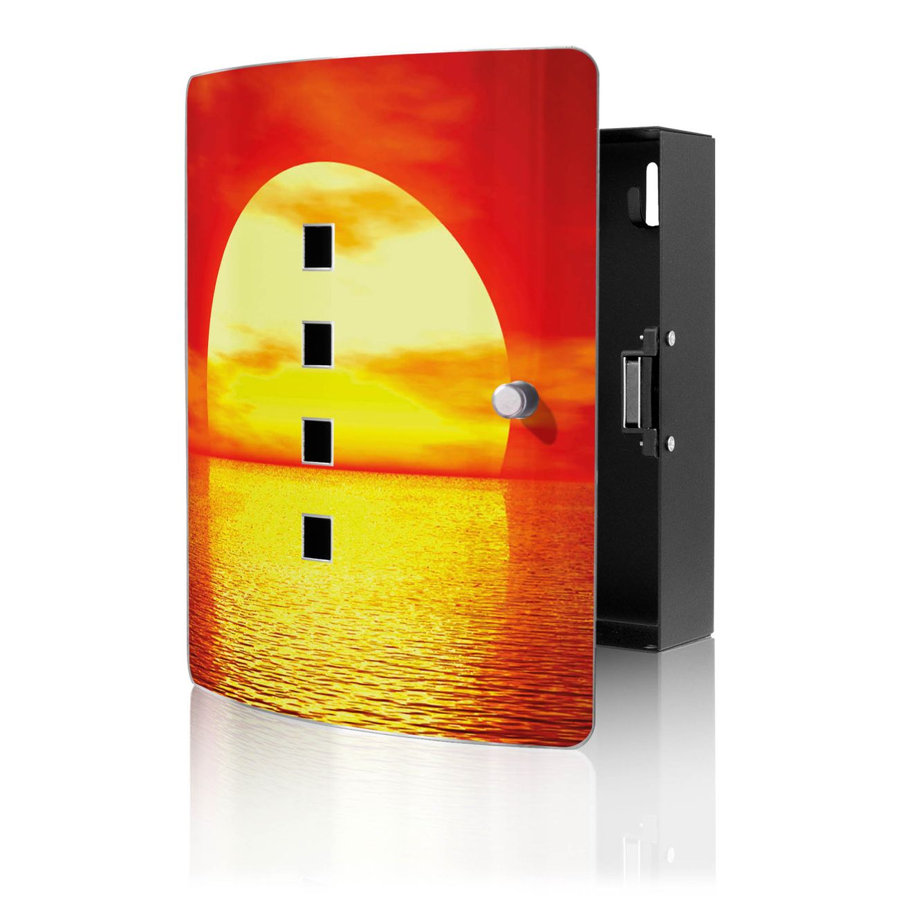 Funktion / Nutzen: Die leicht geschwungene Edelstahltür ist mit einer hochwertigen Motivfolie und dem Motiv Motiv Sonnenuntergang kaschiert. Ein praktischer Magnetverschluss ermöglicht Ihnen ein schnelles Öffnen und Schließen. Befestigt wird der Schlüsselkasten an 2 Stellen auf der Rückseite, passendes Montagematerial fügen wir bereits bei.