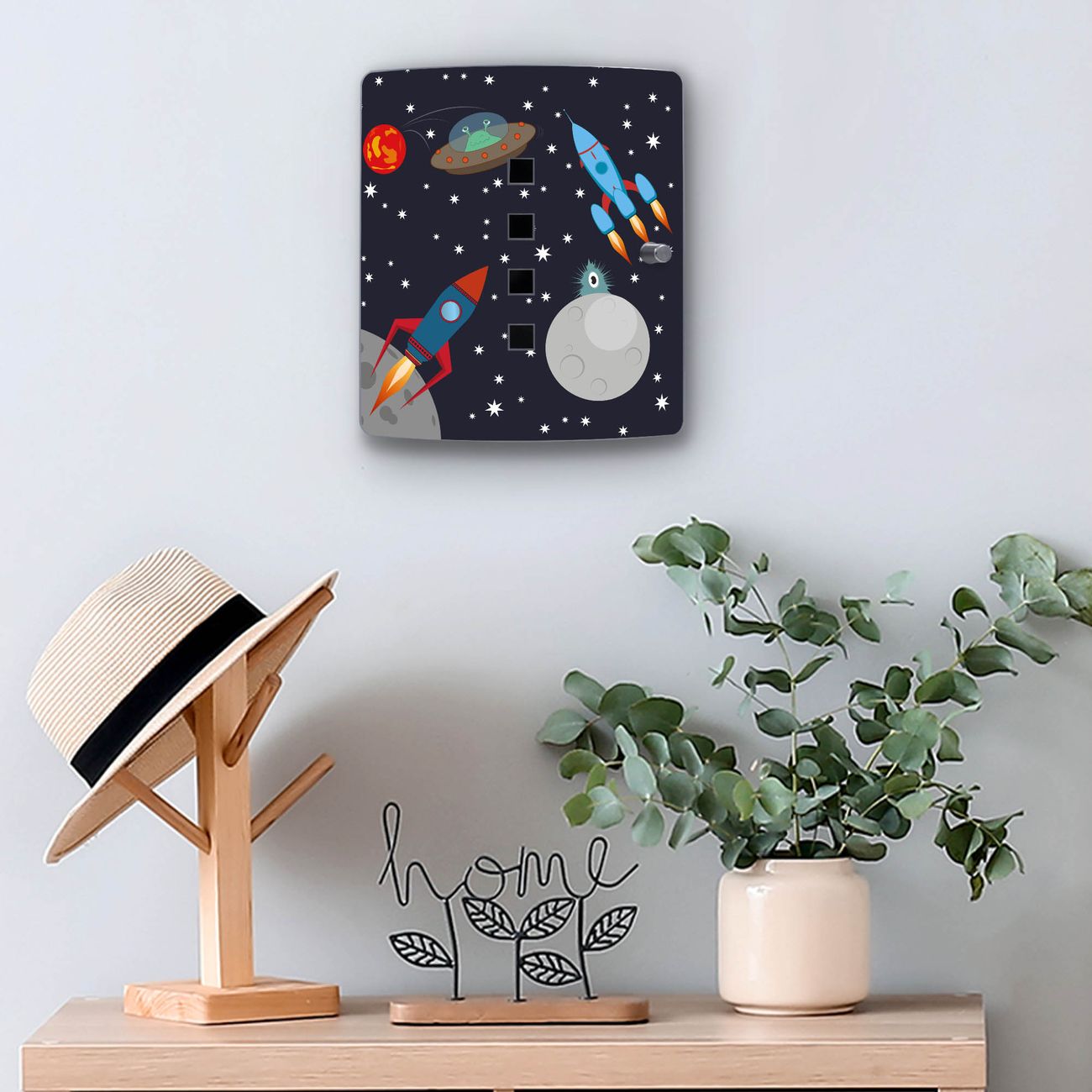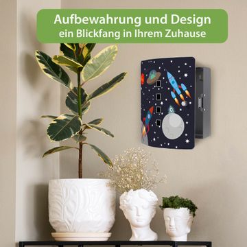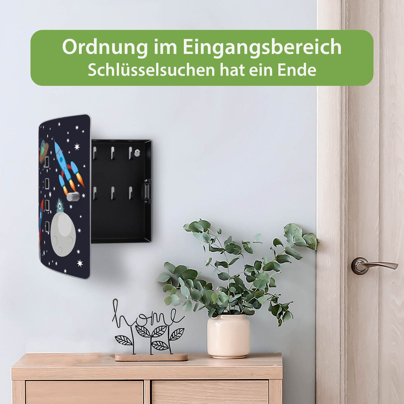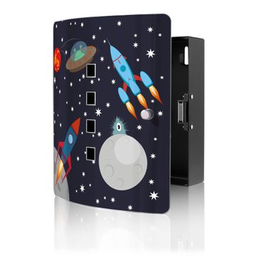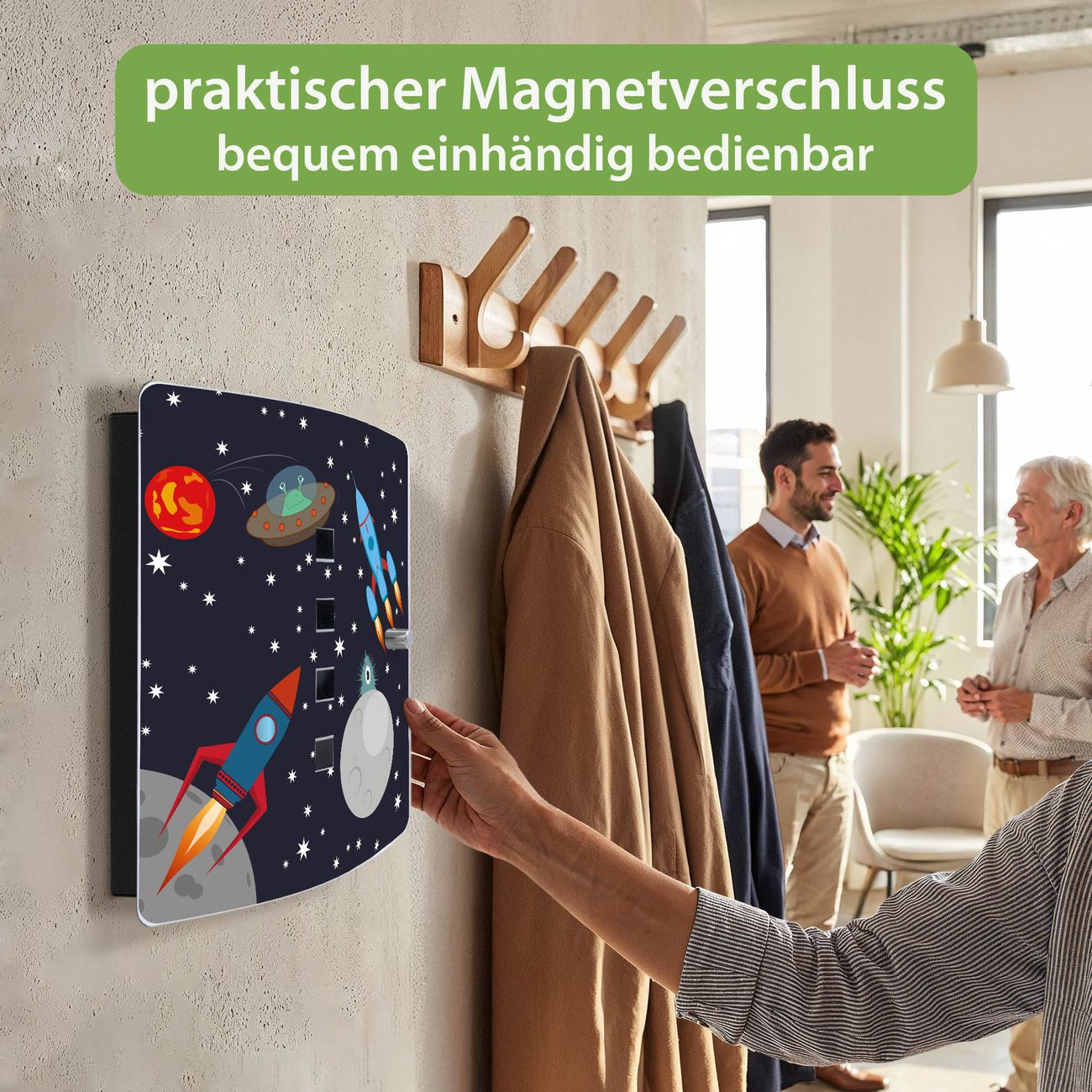 Funktion / Nutzen: Die leicht geschwungene Edelstahltür ist mit einer hochwertigen Motivfolie und dem Motiv Motiv Space Traffic kaschiert. Ein praktischer Magnetverschluss ermöglicht Ihnen ein schnelles Öffnen und Schließen. Befestigt wird der Schlüsselkasten an 2 Stellen auf der Rückseite, passendes Montagematerial fügen wir bereits bei.