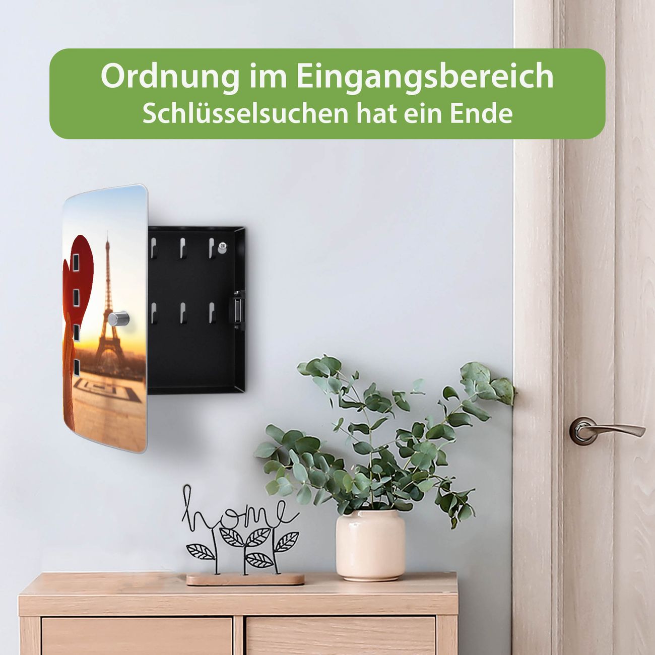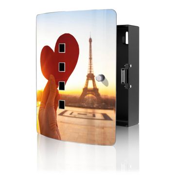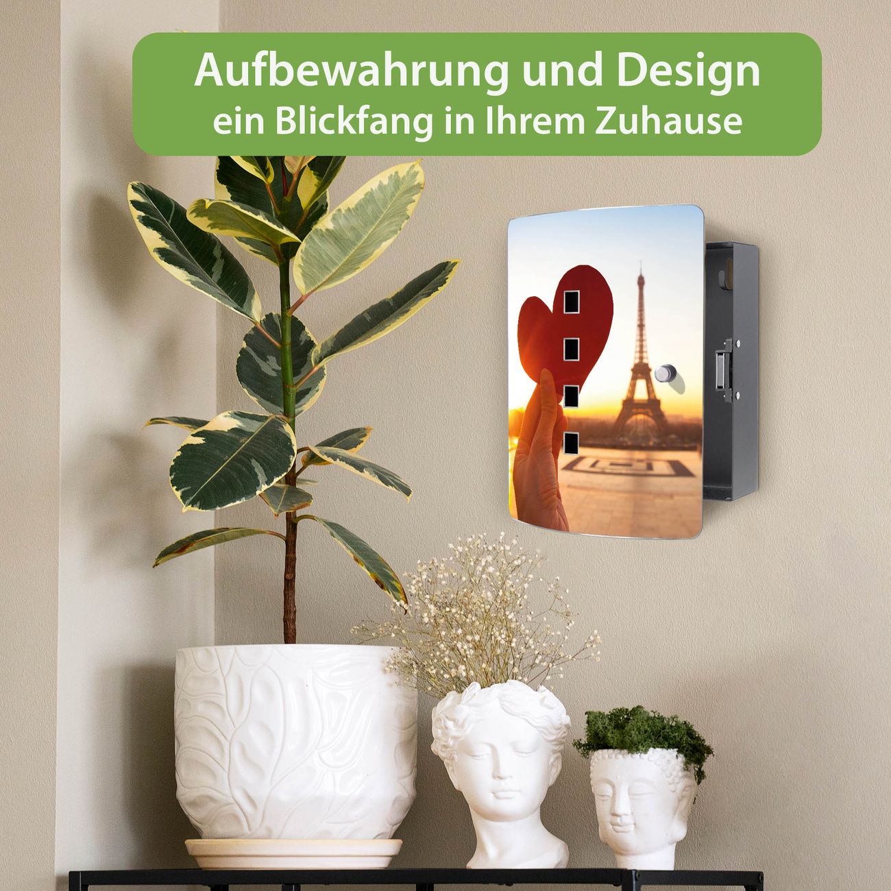 Funktion / Nutzen: Die leicht geschwungene Edelstahltür ist mit einer hochwertigen Motivfolie und dem Motiv Motiv Stadt Der Liebe kaschiert. Ein praktischer Magnetverschluss ermöglicht Ihnen ein schnelles Öffnen und Schließen. Befestigt wird der Schlüsselkasten an 2 Stellen auf der Rückseite, passendes Montagematerial fügen wir bereits bei.