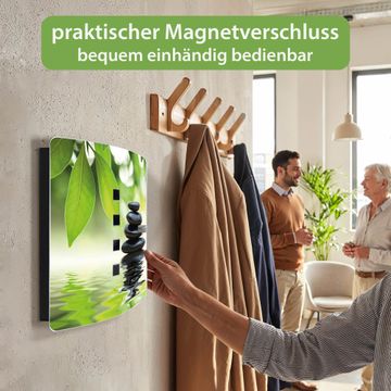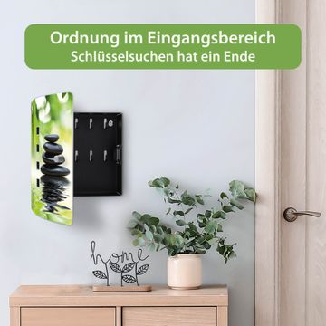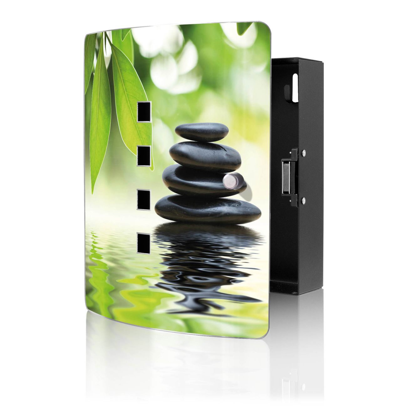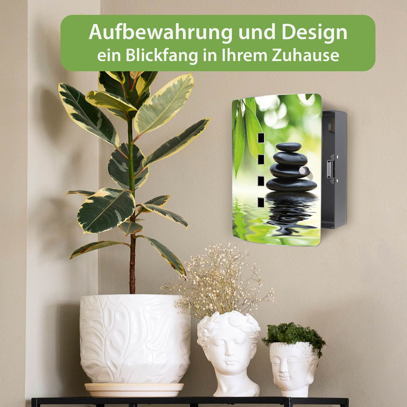 Funktion / Nutzen: Die leicht geschwungene Edelstahltür ist mit einer hochwertigen Motivfolie und dem Motiv Motiv Steine&Relax kaschiert. Ein praktischer Magnetverschluss ermöglicht Ihnen ein schnelles Öffnen und Schließen. Befestigt wird der Schlüsselkasten an 2 Stellen auf der Rückseite, passendes Montagematerial fügen wir bereits bei.