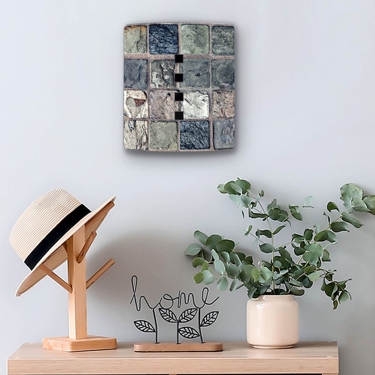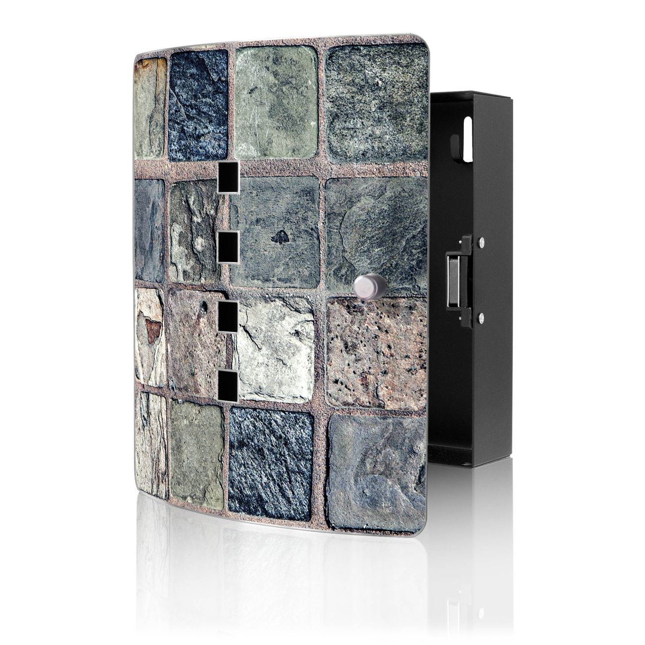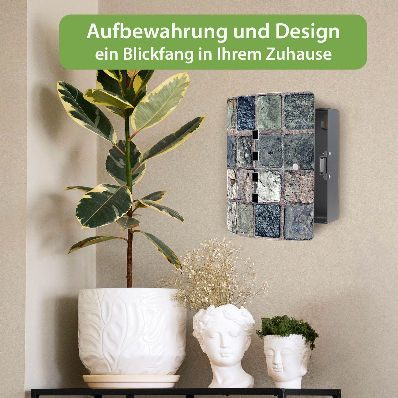 Funktion / Nutzen: Die leicht geschwungene Edelstahltür ist mit einer hochwertigen Motivfolie und dem Motiv Motiv Steinfliesen kaschiert. Ein praktischer Magnetverschluss ermöglicht Ihnen ein schnelles Öffnen und Schließen. Befestigt wird der Schlüsselkasten an 2 Stellen auf der Rückseite, passendes Montagematerial fügen wir bereits bei.