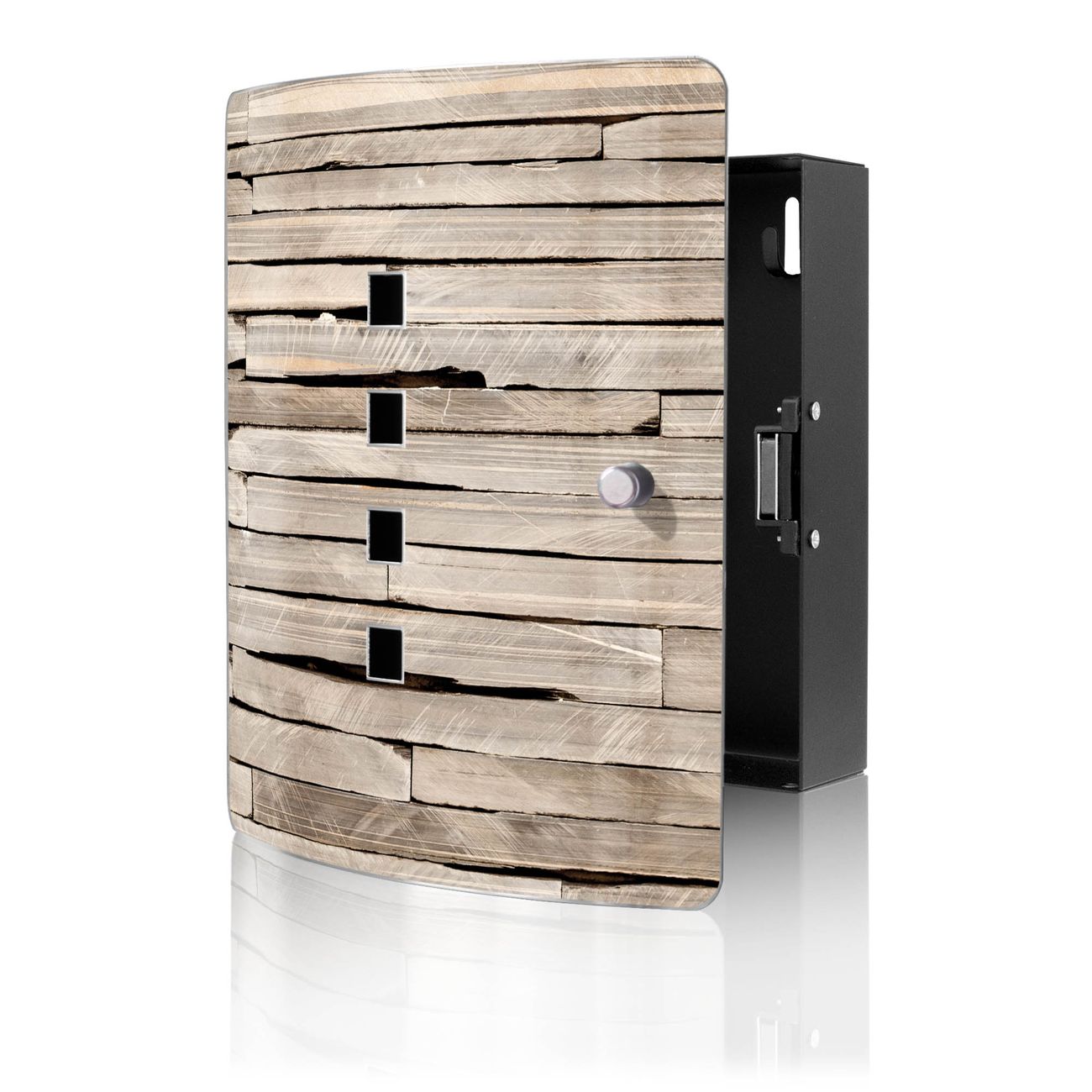 Der Schlüsselkasten ist gesamt 24x21x5cm groß und wiegt ca. 900g. Die Fronttür hat eine 90° Öffnung und besteht aus Edelstahl. Das Gehäuse ist zeitlos schwarz und aus Stahl gefertigt.