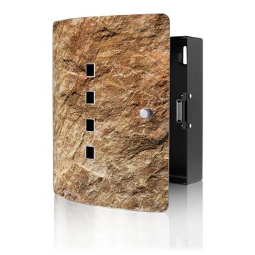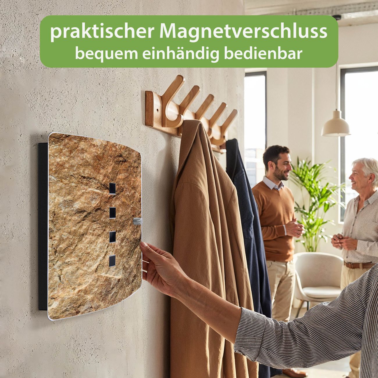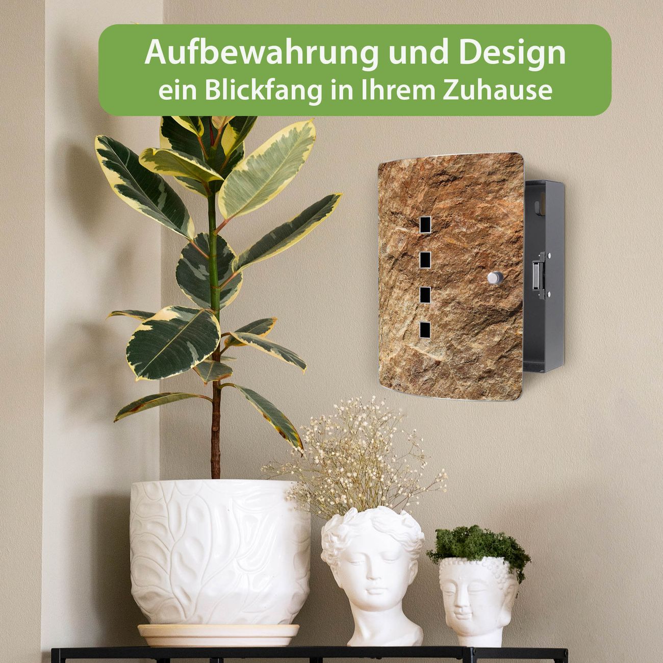 Funktion / Nutzen: Die leicht geschwungene Edelstahltür ist mit einer hochwertigen Motivfolie und dem Motiv Motiv Steinstruktur kaschiert. Ein praktischer Magnetverschluss ermöglicht Ihnen ein schnelles Öffnen und Schließen. Befestigt wird der Schlüsselkasten an 2 Stellen auf der Rückseite, passendes Montagematerial fügen wir bereits bei.