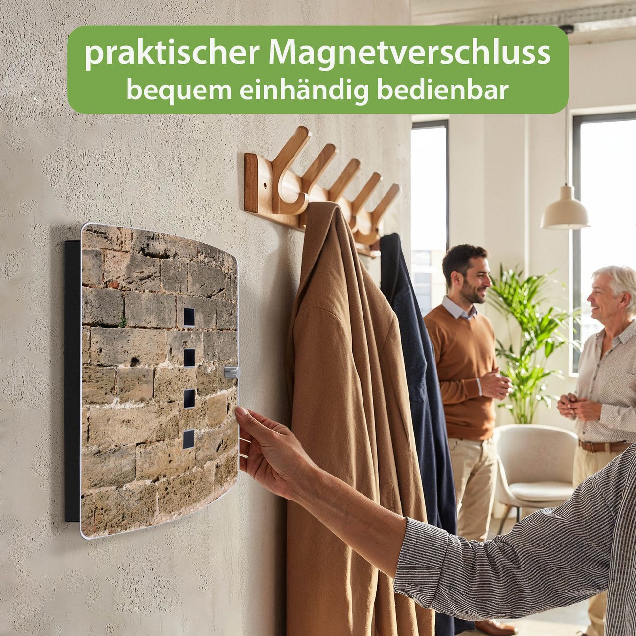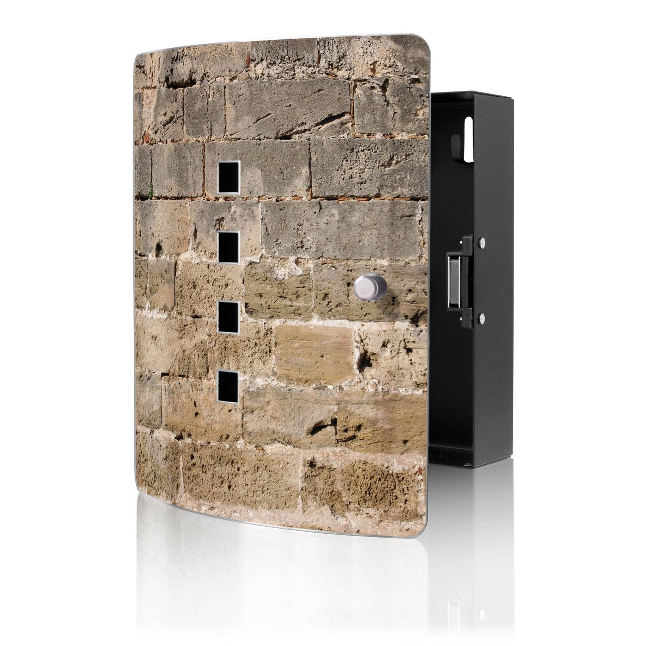 Funktion / Nutzen: Die leicht geschwungene Edelstahltür ist mit einer hochwertigen Motivfolie und dem Motiv Motiv Steinwand Antik kaschiert. Ein praktischer Magnetverschluss ermöglicht Ihnen ein schnelles Öffnen und Schließen. Befestigt wird der Schlüsselkasten an 2 Stellen auf der Rückseite, passendes Montagematerial fügen wir bereits bei.