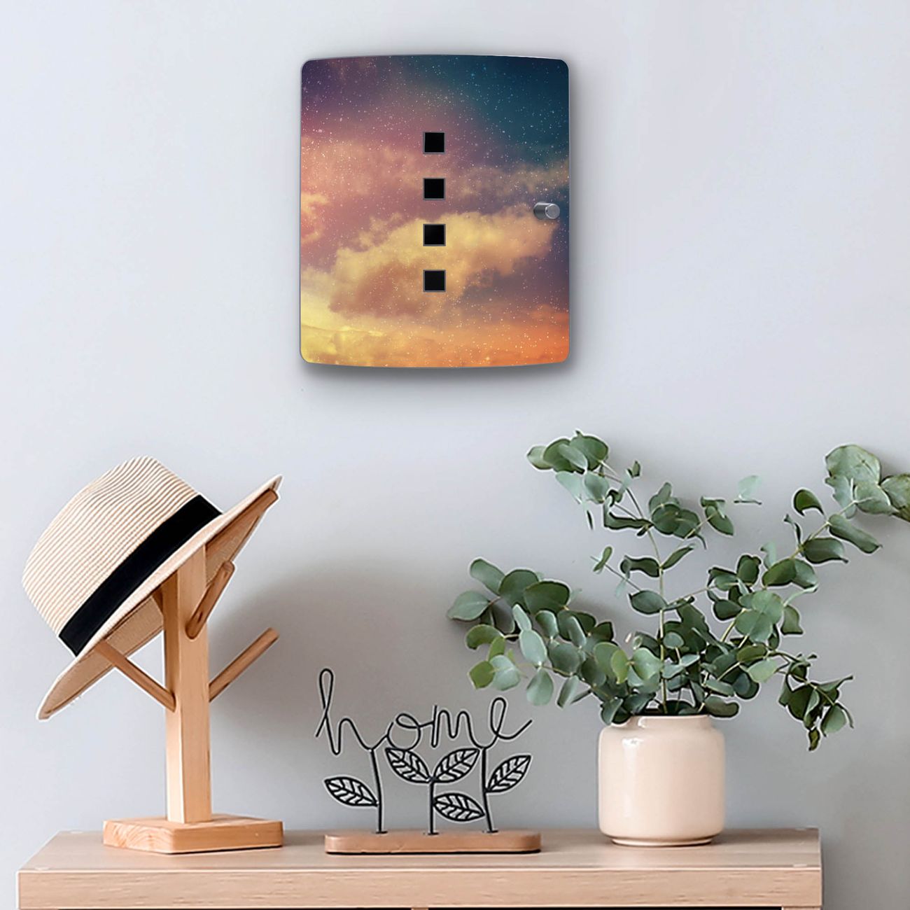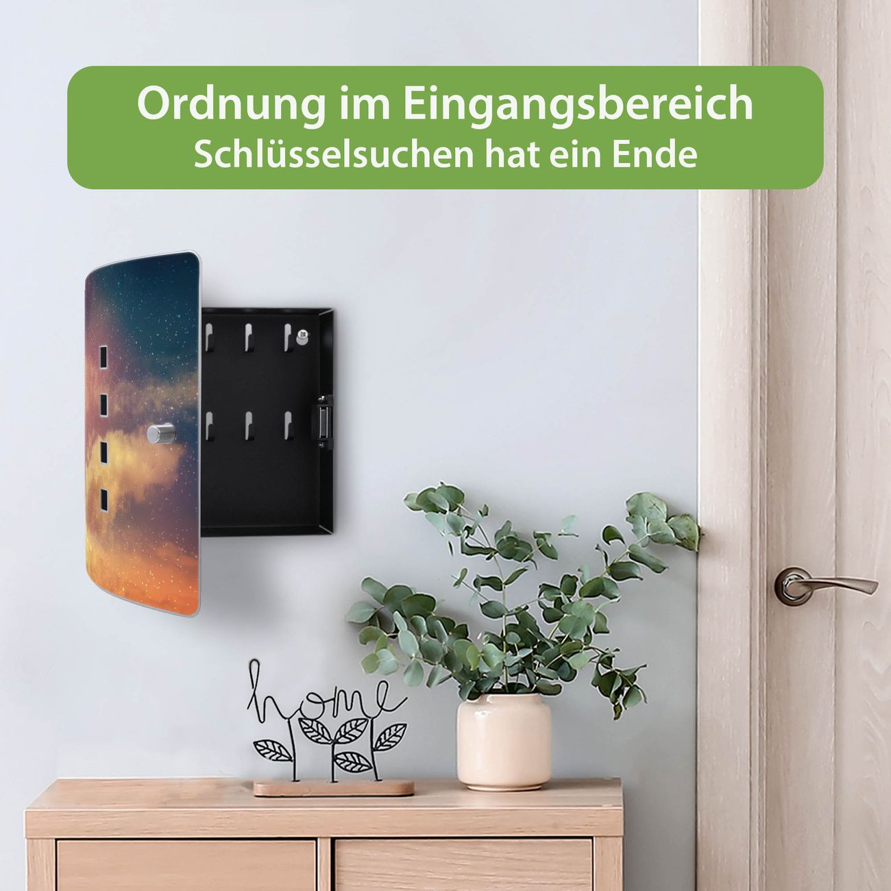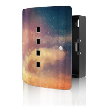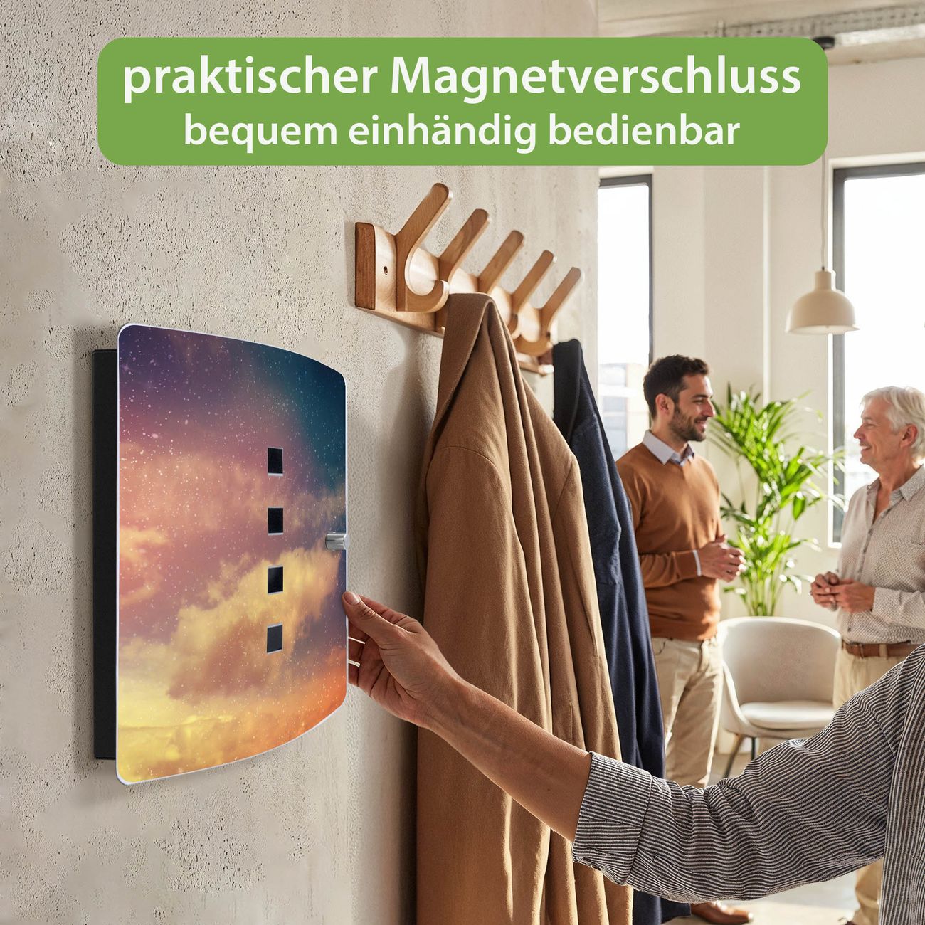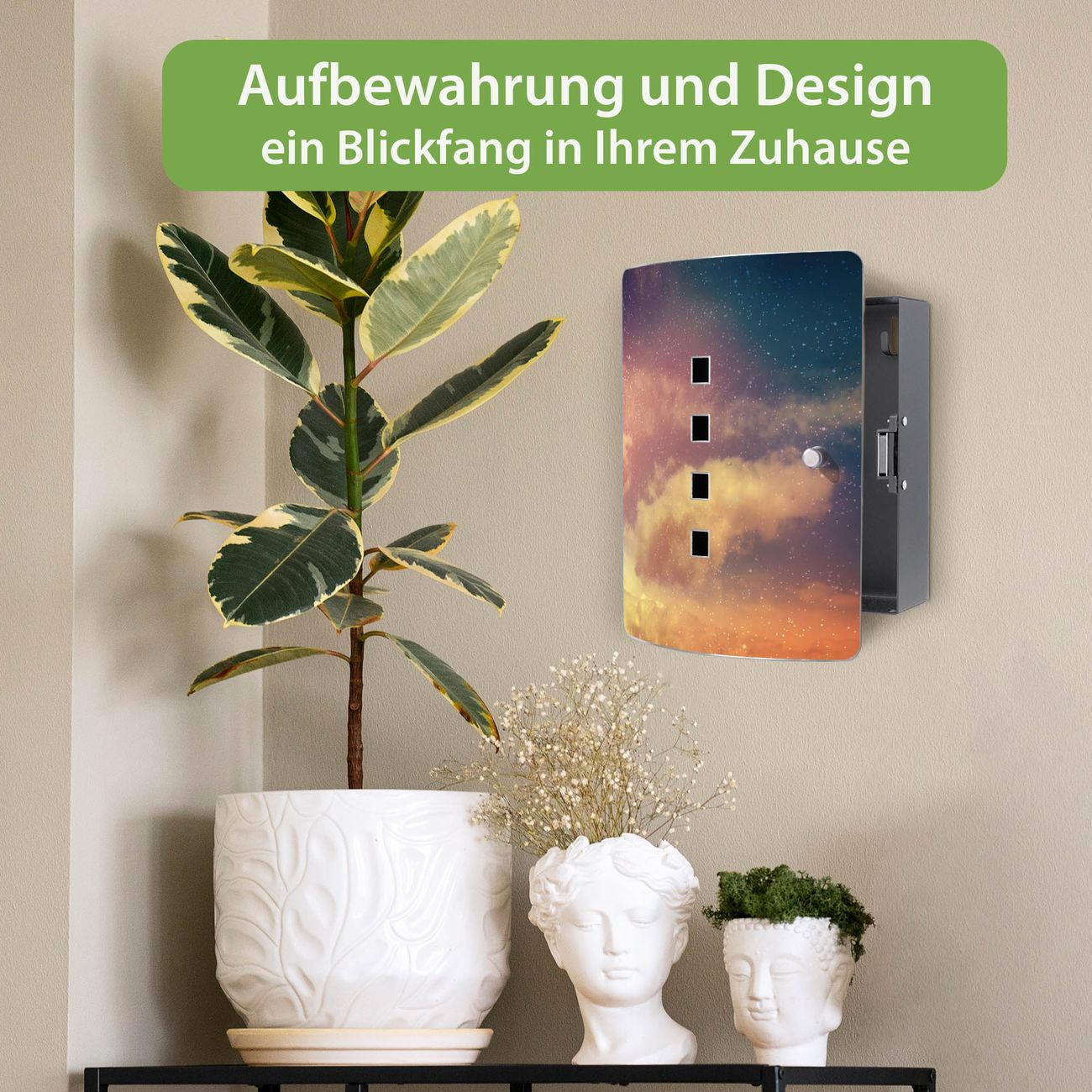 Funktion / Nutzen: Die leicht geschwungene Edelstahltür ist mit einer hochwertigen Motivfolie und dem Motiv Motiv Sternenhimmel kaschiert. Ein praktischer Magnetverschluss ermöglicht Ihnen ein schnelles Öffnen und Schließen. Befestigt wird der Schlüsselkasten an 2 Stellen auf der Rückseite, passendes Montagematerial fügen wir bereits bei.