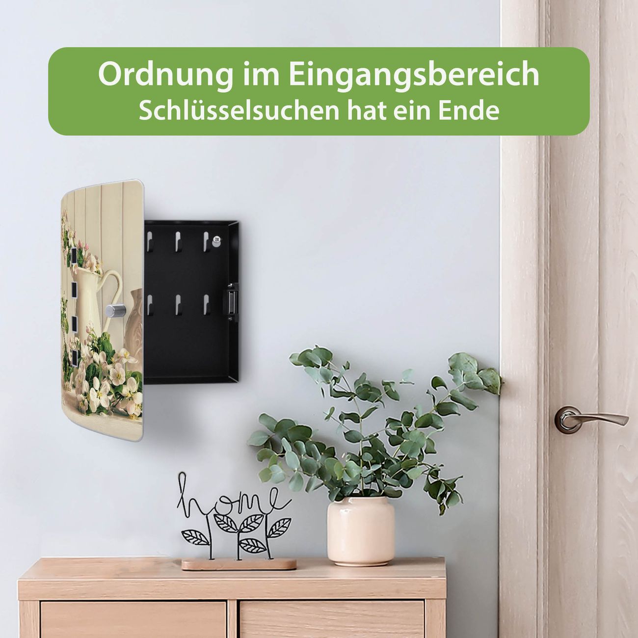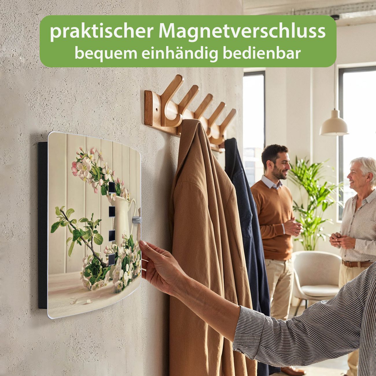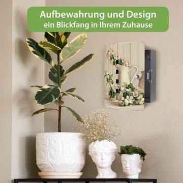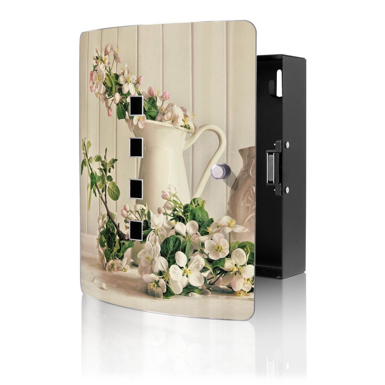 Funktion / Nutzen: Die leicht geschwungene Edelstahltür ist mit einer hochwertigen Motivfolie und dem Motiv Motiv Stillleben Kirschblüten kaschiert. Ein praktischer Magnetverschluss ermöglicht Ihnen ein schnelles Öffnen und Schließen. Befestigt wird der Schlüsselkasten an 2 Stellen auf der Rückseite, passendes Montagematerial fügen wir bereits bei.