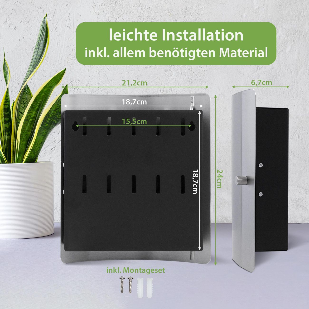 Der Schlüsselkasten ist gesamt 24x21x5cm groß und wiegt ca. 900g. Die Fronttür hat eine 90° Öffnung und besteht aus Edelstahl. Das Gehäuse ist zeitlos schwarz und aus Stahl gefertigt.