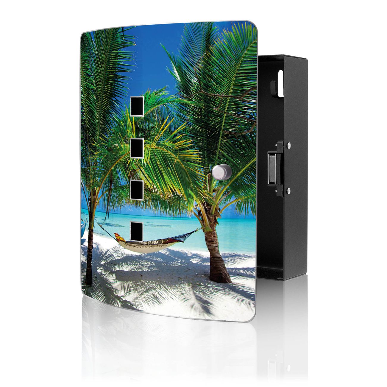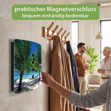 Funktion / Nutzen: Die leicht geschwungene Edelstahltür ist mit einer hochwertigen Motivfolie und dem Motiv Motiv Strand kaschiert. Ein praktischer Magnetverschluss ermöglicht Ihnen ein schnelles Öffnen und Schließen. Befestigt wird der Schlüsselkasten an 2 Stellen auf der Rückseite, passendes Montagematerial fügen wir bereits bei.