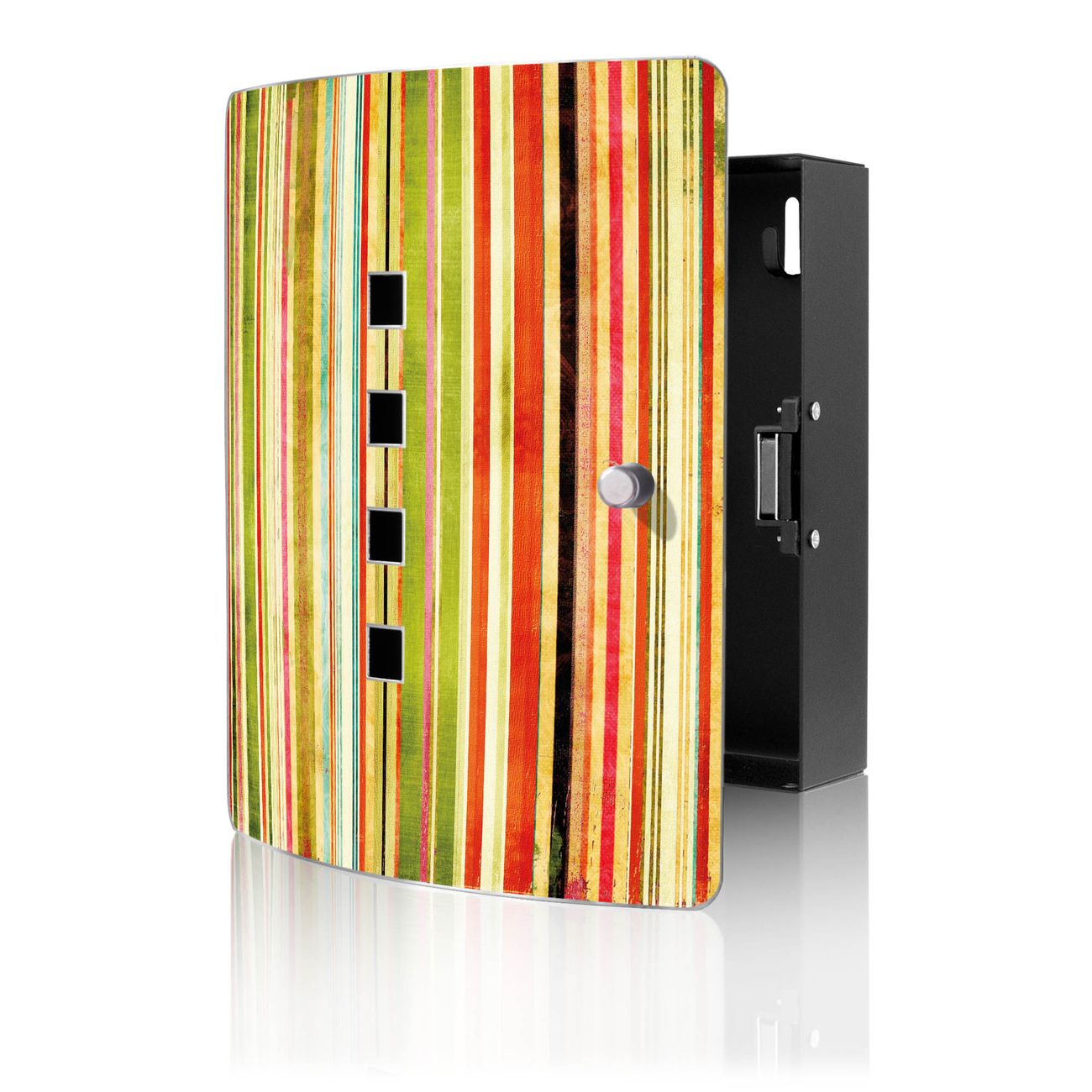 Funktion / Nutzen: Die leicht geschwungene Edelstahltür ist mit einer hochwertigen Motivfolie und dem Motiv Motiv Streifen kaschiert. Ein praktischer Magnetverschluss ermöglicht Ihnen ein schnelles Öffnen und Schließen. Befestigt wird der Schlüsselkasten an 2 Stellen auf der Rückseite, passendes Montagematerial fügen wir bereits bei.