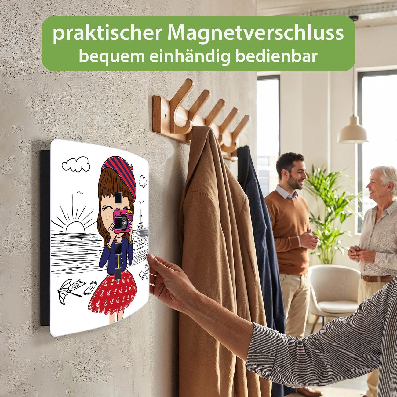Funktion / Nutzen: Die leicht geschwungene Edelstahltür ist mit einer hochwertigen Motivfolie und dem Motiv Motiv Süße Kamera kaschiert. Ein praktischer Magnetverschluss ermöglicht Ihnen ein schnelles Öffnen und Schließen. Befestigt wird der Schlüsselkasten an 2 Stellen auf der Rückseite, passendes Montagematerial fügen wir bereits bei.