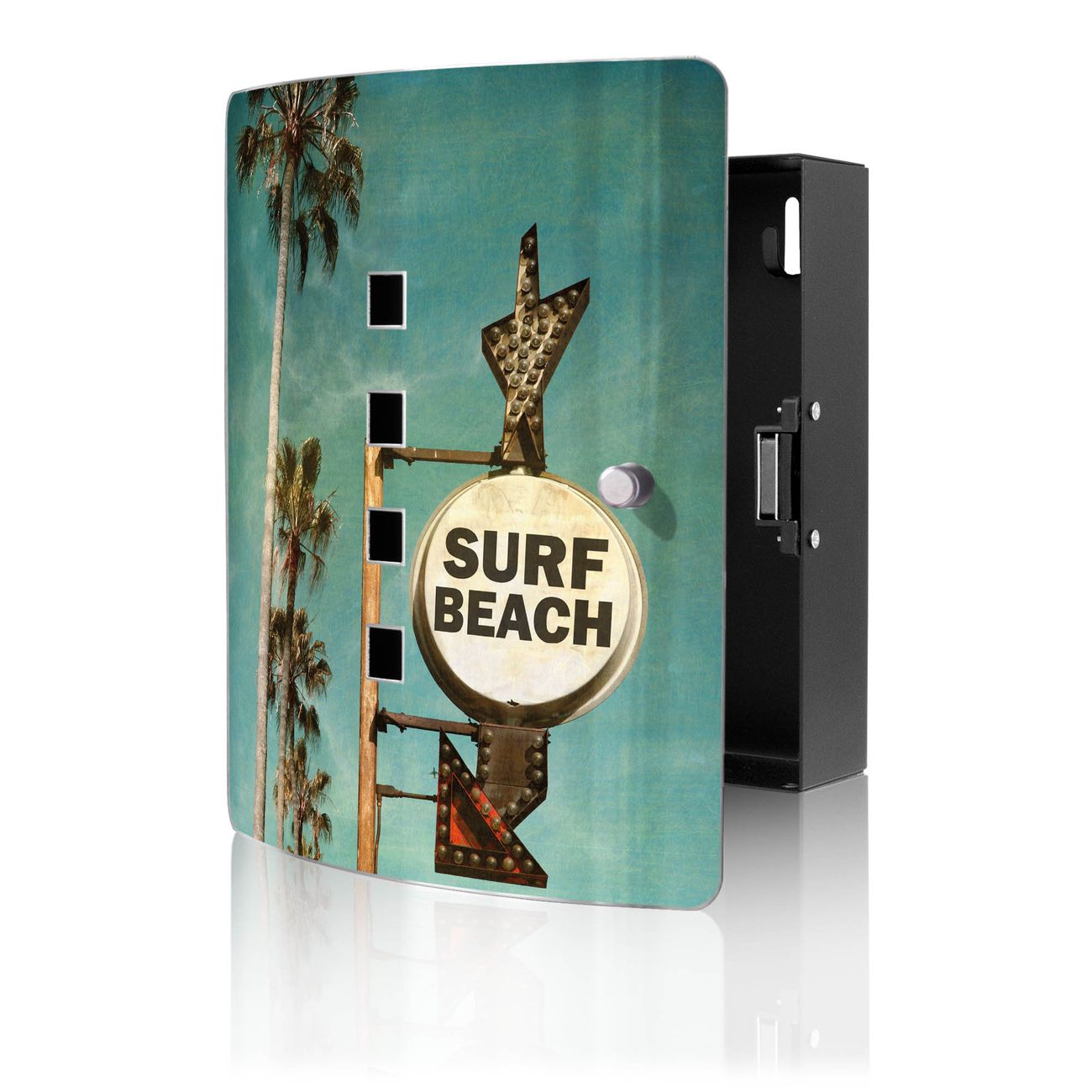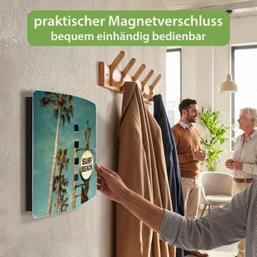 Funktion / Nutzen: Die leicht geschwungene Edelstahltür ist mit einer hochwertigen Motivfolie und dem Motiv Motiv Surf Beach kaschiert. Ein praktischer Magnetverschluss ermöglicht Ihnen ein schnelles Öffnen und Schließen. Befestigt wird der Schlüsselkasten an 2 Stellen auf der Rückseite, passendes Montagematerial fügen wir bereits bei.