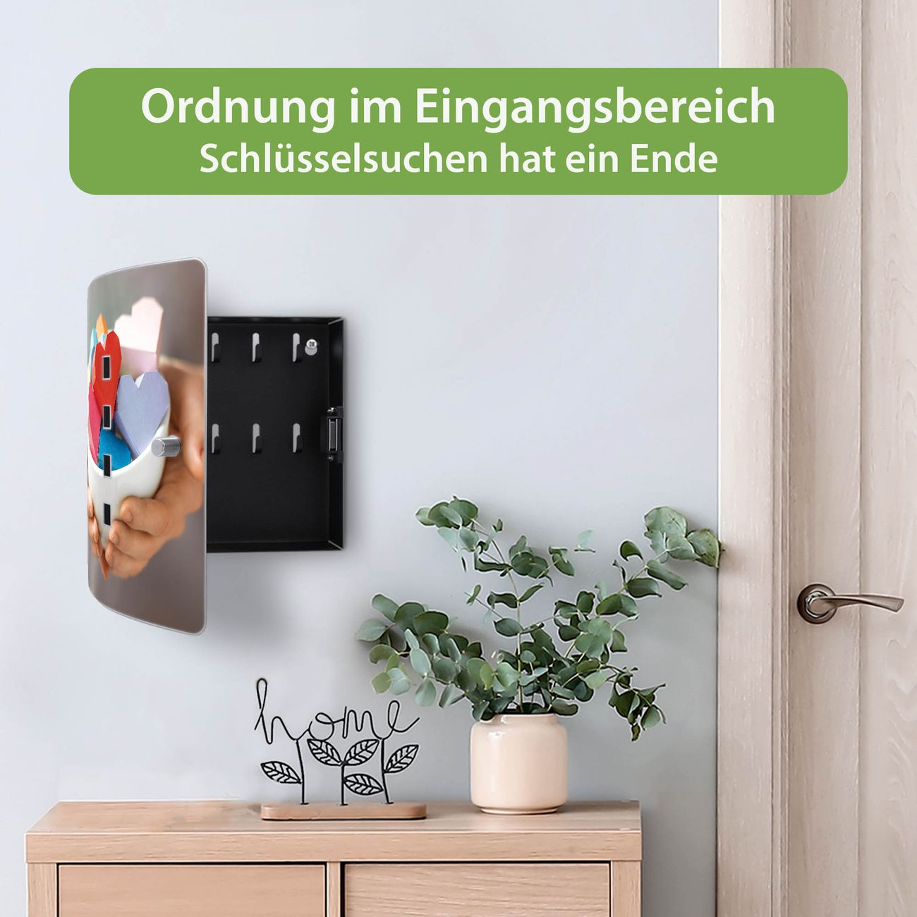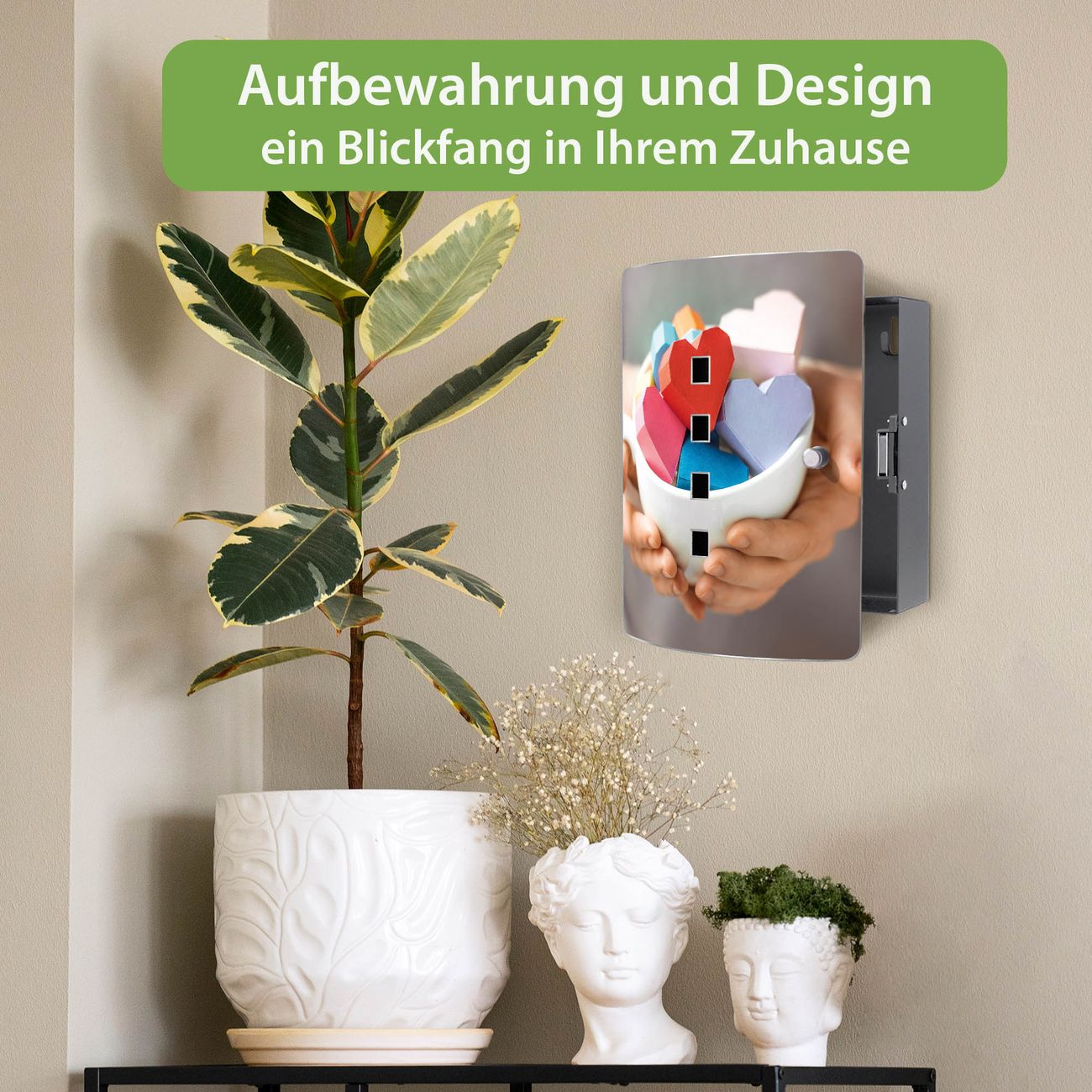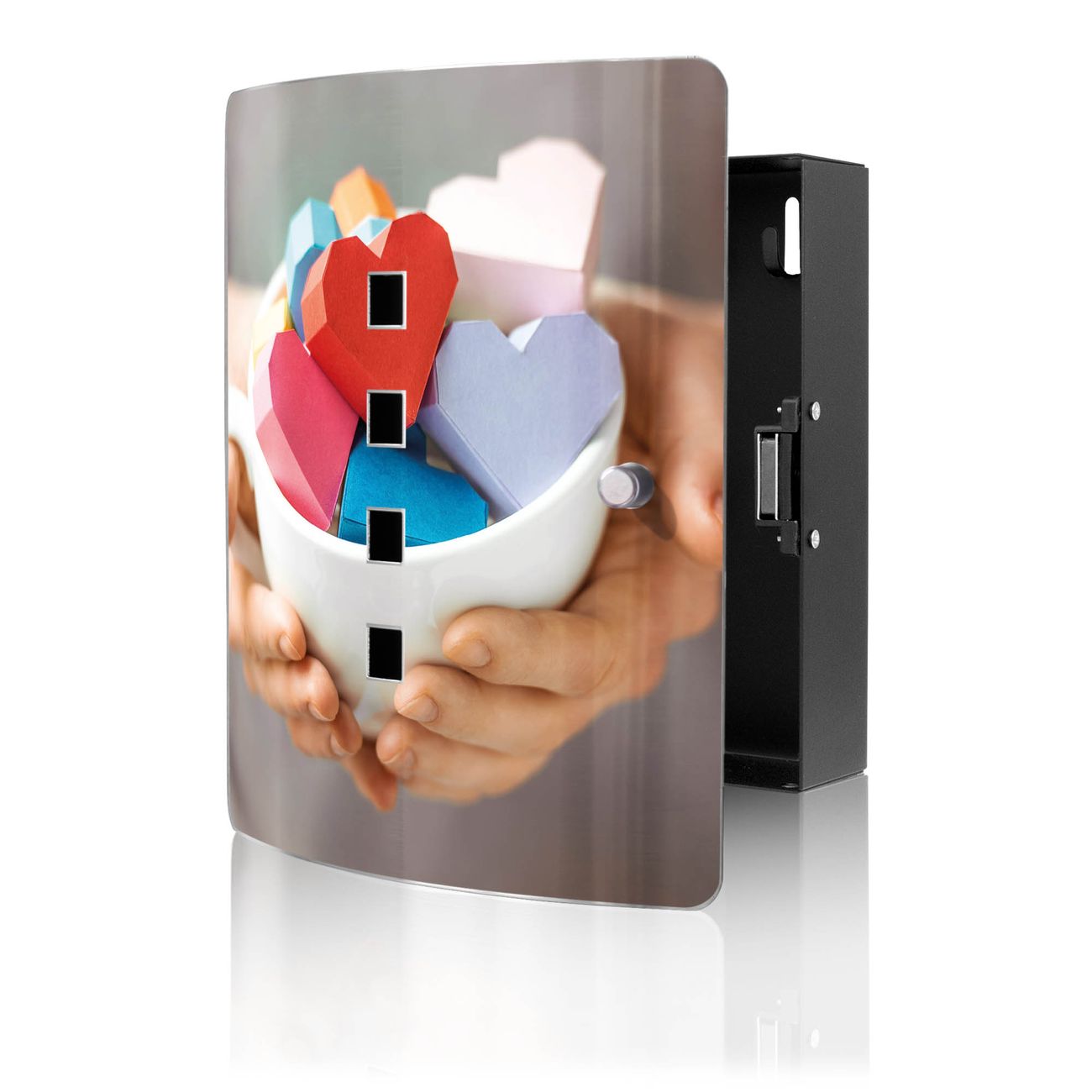 Funktion / Nutzen: Die leicht geschwungene Edelstahltür ist mit einer hochwertigen Motivfolie und dem Motiv Motiv Tasse voller Herzen kaschiert. Ein praktischer Magnetverschluss ermöglicht Ihnen ein schnelles Öffnen und Schließen. Befestigt wird der Schlüsselkasten an 2 Stellen auf der Rückseite, passendes Montagematerial fügen wir bereits bei.