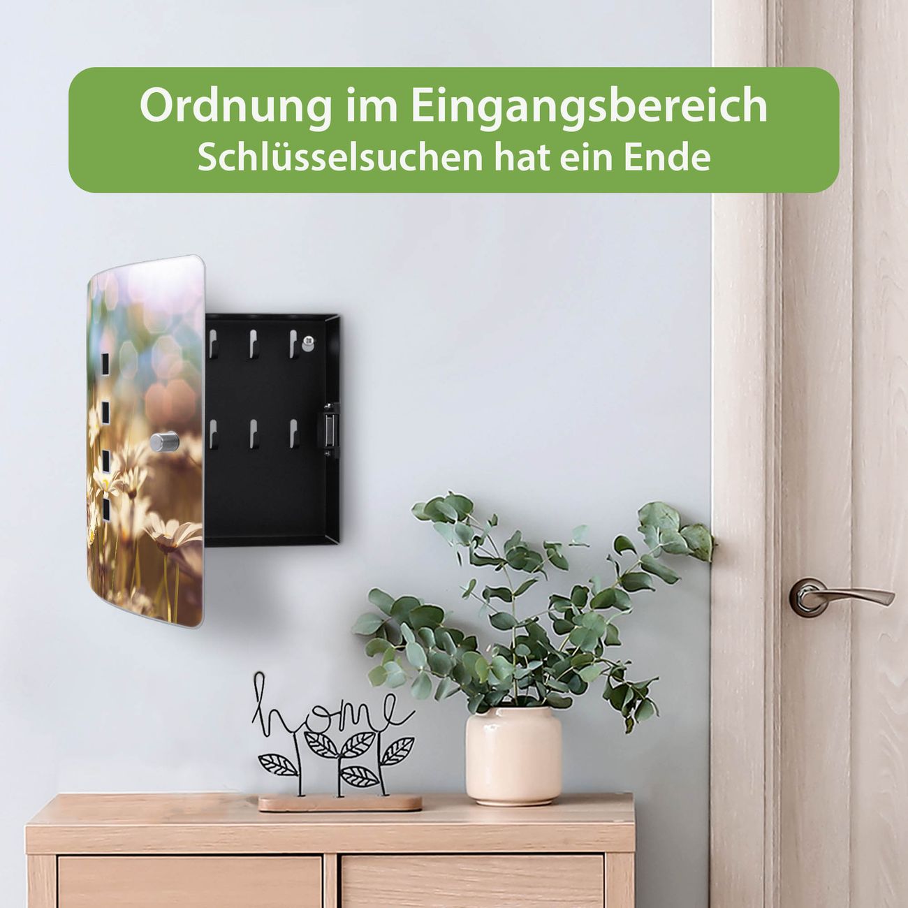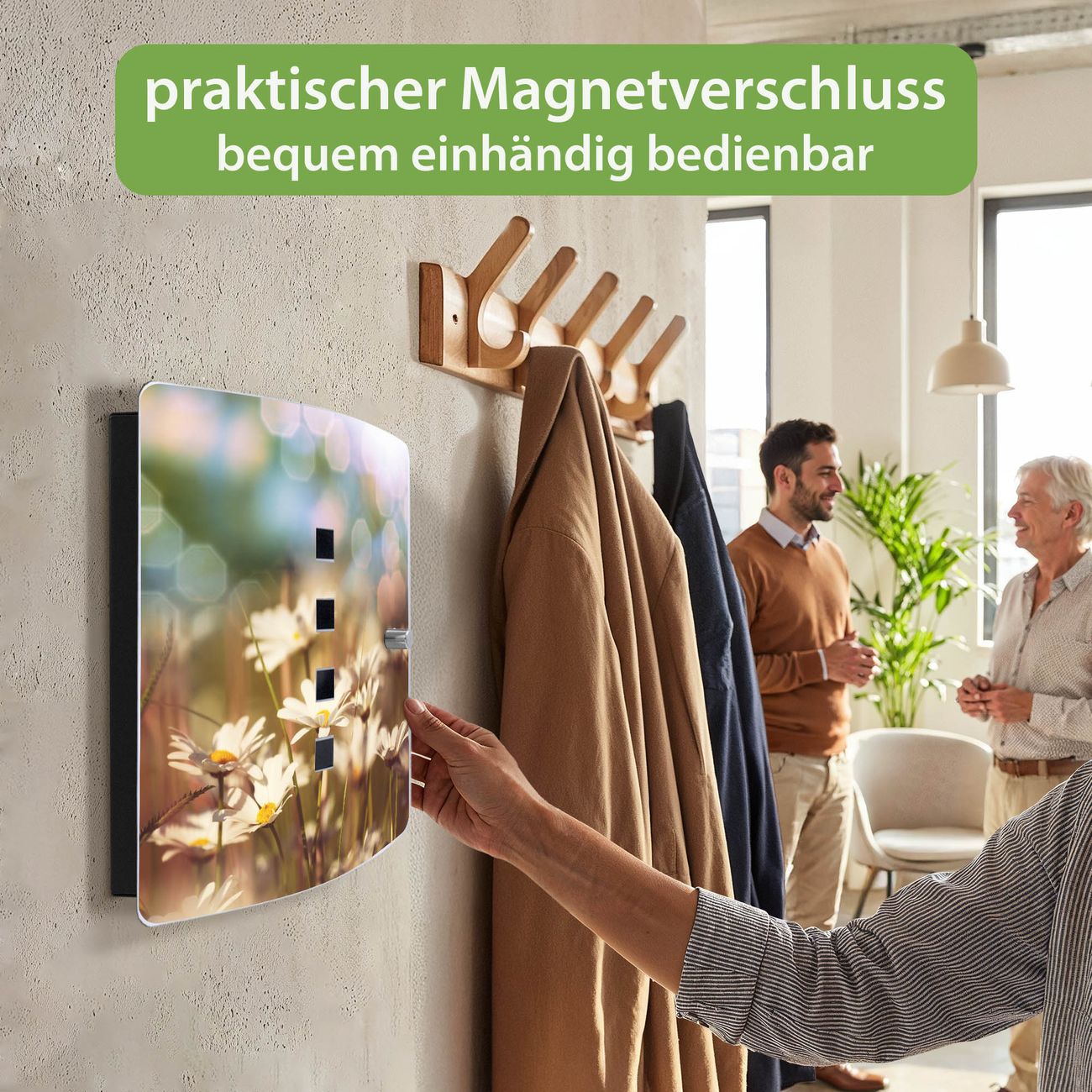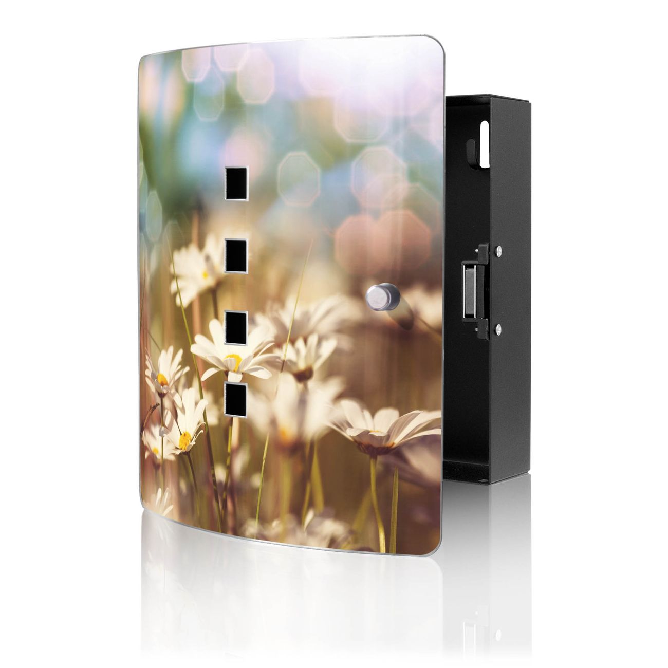 Funktion / Nutzen: Die leicht geschwungene Edelstahltür ist mit einer hochwertigen Motivfolie und dem Motiv Motiv Tausendschönwiese kaschiert. Ein praktischer Magnetverschluss ermöglicht Ihnen ein schnelles Öffnen und Schließen. Befestigt wird der Schlüsselkasten an 2 Stellen auf der Rückseite, passendes Montagematerial fügen wir bereits bei.