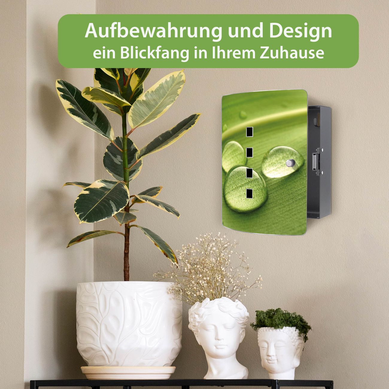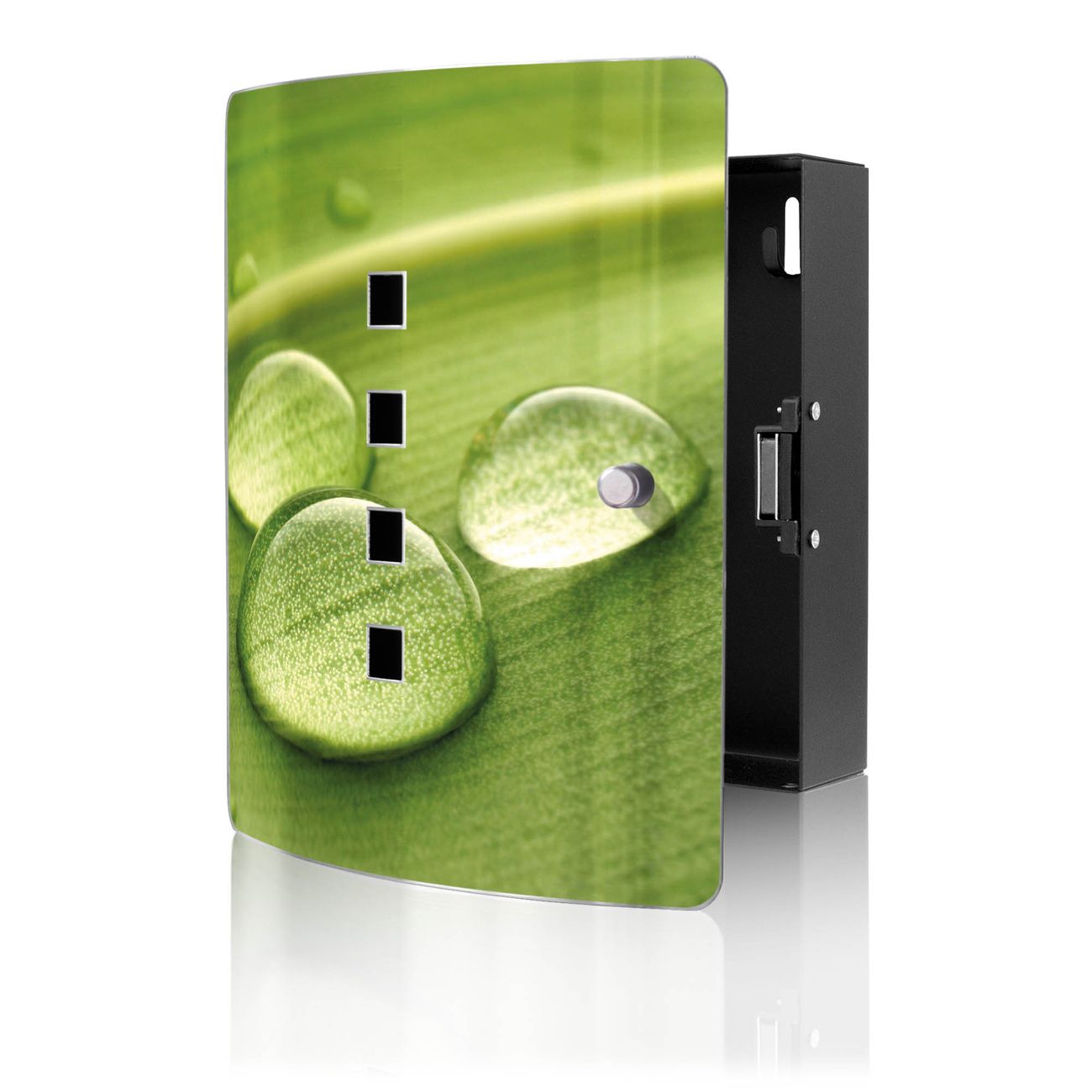 Funktion / Nutzen: Die leicht geschwungene Edelstahltür ist mit einer hochwertigen Motivfolie und dem Motiv Motiv Tautropfen kaschiert. Ein praktischer Magnetverschluss ermöglicht Ihnen ein schnelles Öffnen und Schließen. Befestigt wird der Schlüsselkasten an 2 Stellen auf der Rückseite, passendes Montagematerial fügen wir bereits bei.