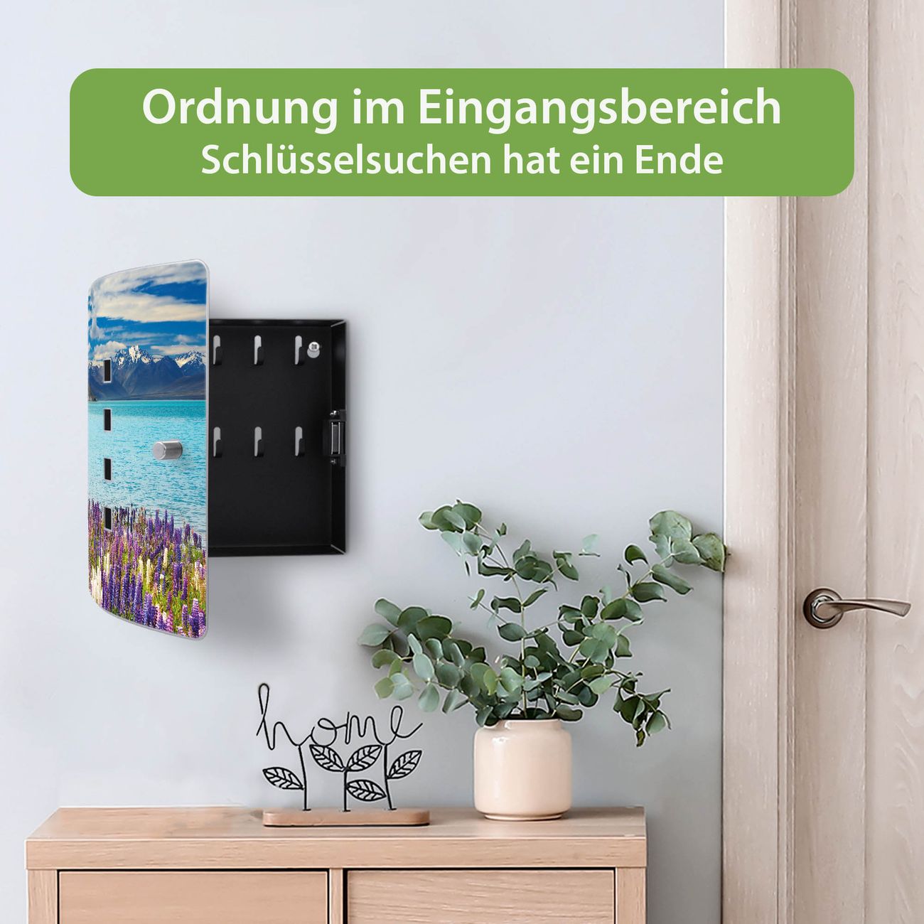 Funktion / Nutzen: Die leicht geschwungene Edelstahltür ist mit einer hochwertigen Motivfolie und dem Motiv Motiv Tekapo See kaschiert. Ein praktischer Magnetverschluss ermöglicht Ihnen ein schnelles Öffnen und Schließen. Befestigt wird der Schlüsselkasten an 2 Stellen auf der Rückseite, passendes Montagematerial fügen wir bereits bei.