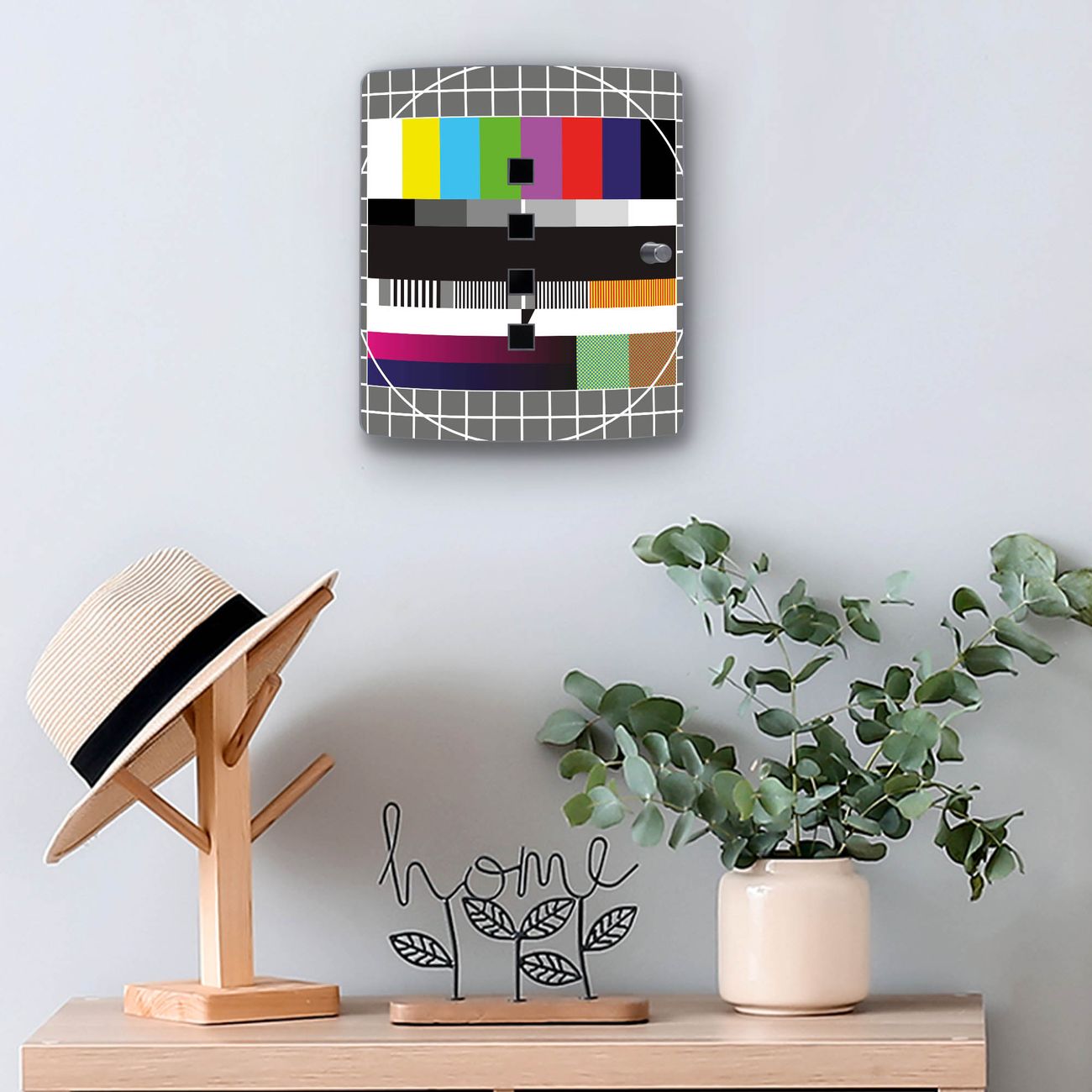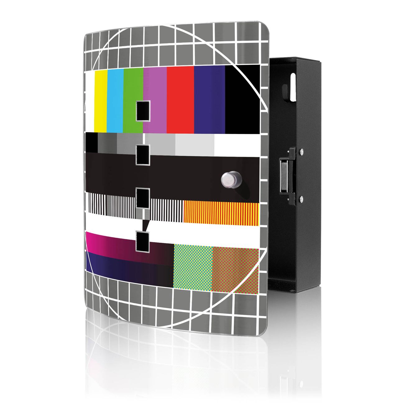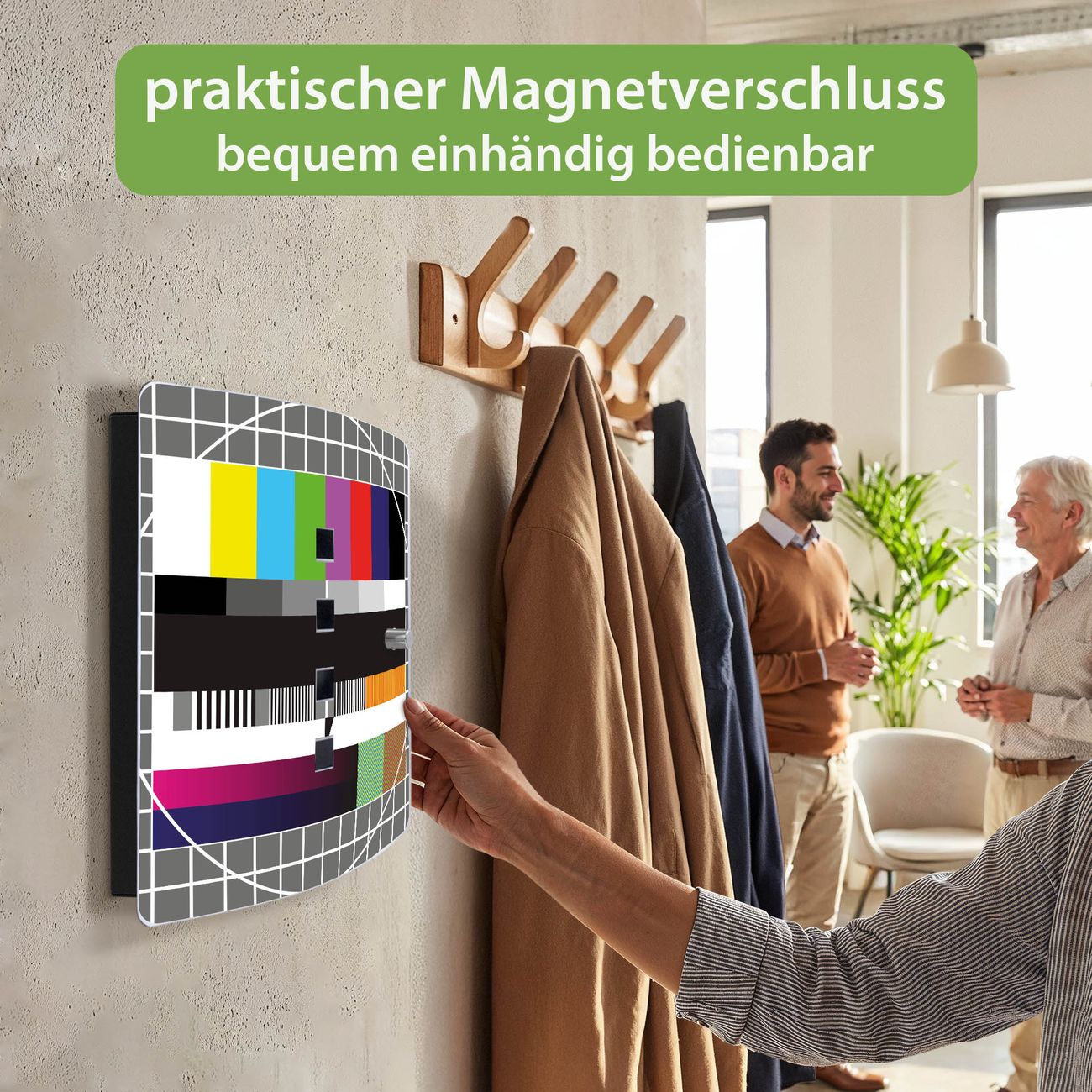 Funktion / Nutzen: Die leicht geschwungene Edelstahltür ist mit einer hochwertigen Motivfolie und dem Motiv Motiv Testbild kaschiert. Ein praktischer Magnetverschluss ermöglicht Ihnen ein schnelles Öffnen und Schließen. Befestigt wird der Schlüsselkasten an 2 Stellen auf der Rückseite, passendes Montagematerial fügen wir bereits bei.