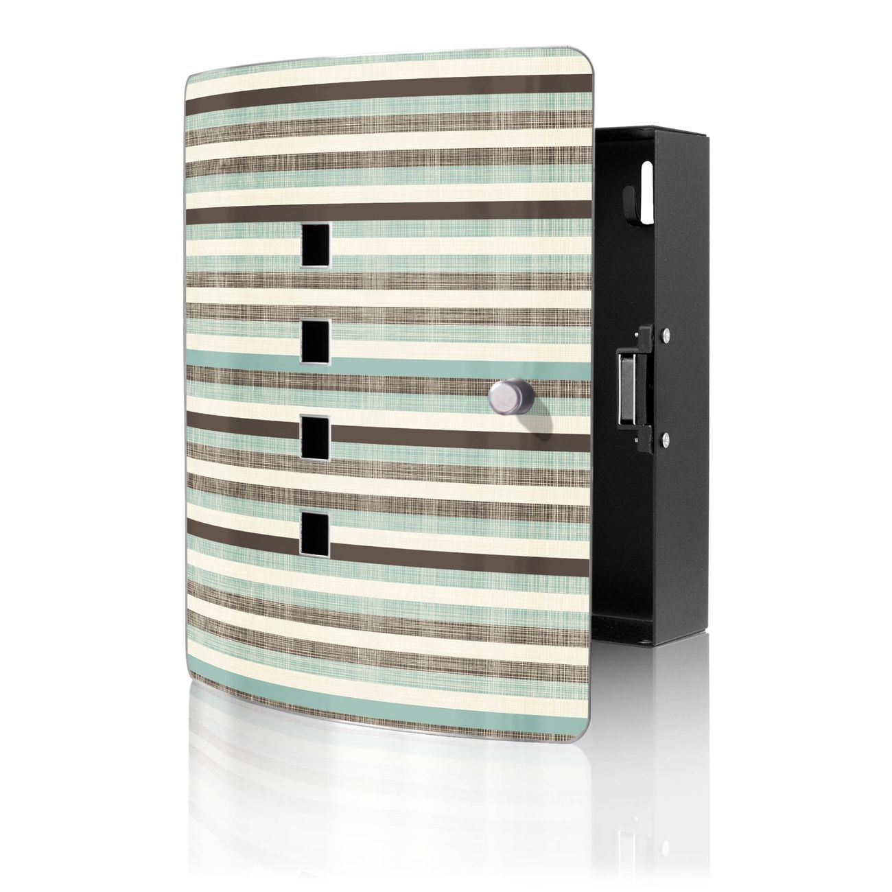 Funktion / Nutzen: Die leicht geschwungene Edelstahltür ist mit einer hochwertigen Motivfolie und dem Motiv Motiv Textile Streifen kaschiert. Ein praktischer Magnetverschluss ermöglicht Ihnen ein schnelles Öffnen und Schließen. Befestigt wird der Schlüsselkasten an 2 Stellen auf der Rückseite, passendes Montagematerial fügen wir bereits bei.