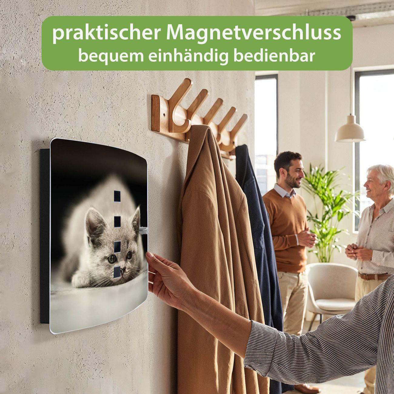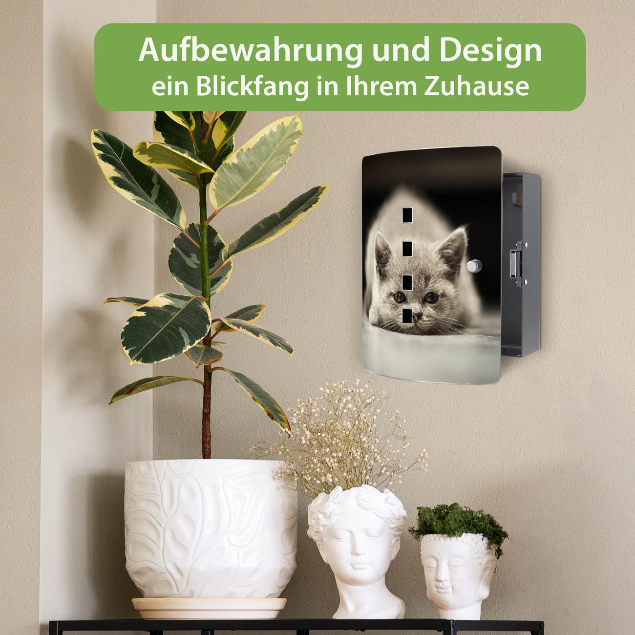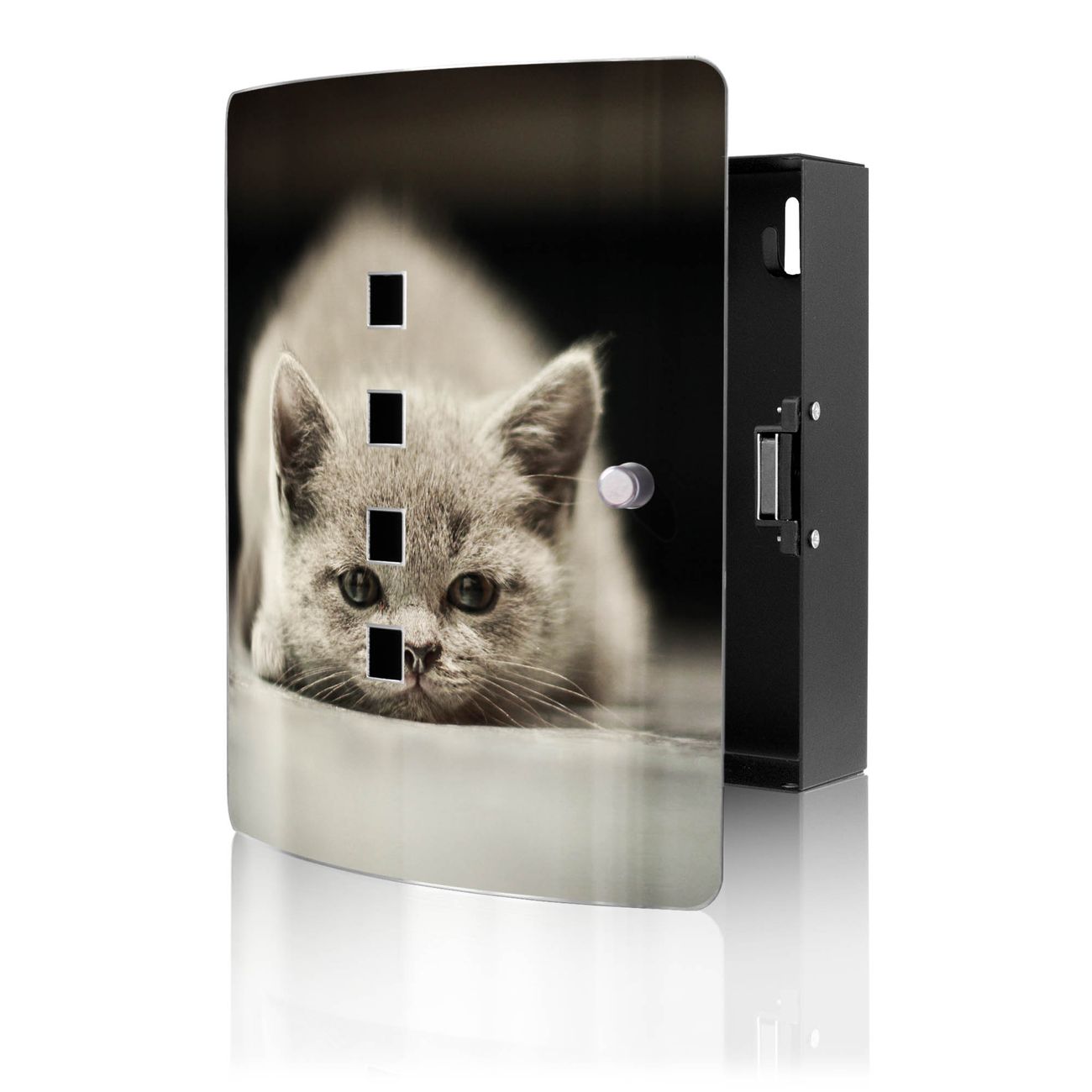 Funktion / Nutzen: Die leicht geschwungene Edelstahltür ist mit einer hochwertigen Motivfolie und dem Motiv Motiv Theodor kaschiert. Ein praktischer Magnetverschluss ermöglicht Ihnen ein schnelles Öffnen und Schließen. Befestigt wird der Schlüsselkasten an 2 Stellen auf der Rückseite, passendes Montagematerial fügen wir bereits bei.