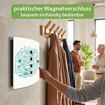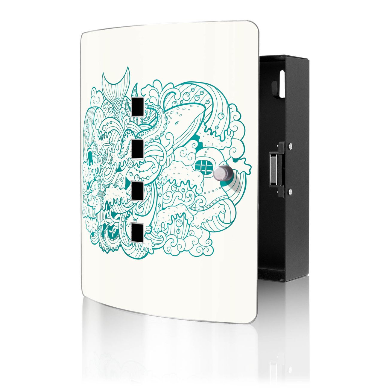 Funktion / Nutzen: Die leicht geschwungene Edelstahltür ist mit einer hochwertigen Motivfolie und dem Motiv Motiv Tiefsee kaschiert. Ein praktischer Magnetverschluss ermöglicht Ihnen ein schnelles Öffnen und Schließen. Befestigt wird der Schlüsselkasten an 2 Stellen auf der Rückseite, passendes Montagematerial fügen wir bereits bei.