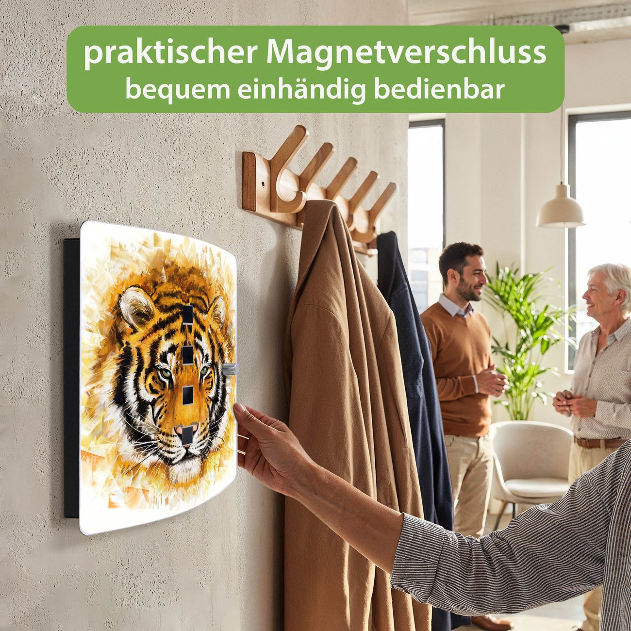 Funktion / Nutzen: Die leicht geschwungene Edelstahltür ist mit einer hochwertigen Motivfolie und dem Motiv Motiv Tigerkopf kaschiert. Ein praktischer Magnetverschluss ermöglicht Ihnen ein schnelles Öffnen und Schließen. Befestigt wird der Schlüsselkasten an 2 Stellen auf der Rückseite, passendes Montagematerial fügen wir bereits bei.