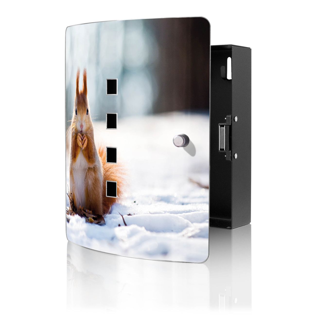 Der Schlüsselkasten ist gesamt 24x21x5cm groß und wiegt ca. 900g. Die Fronttür hat eine 90° Öffnung und besteht aus Edelstahl. Das Gehäuse ist zeitlos schwarz und aus Stahl gefertigt.