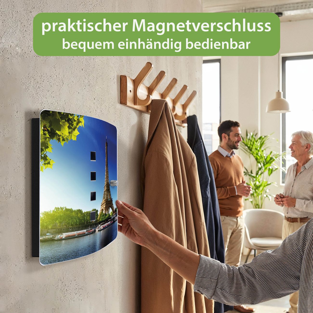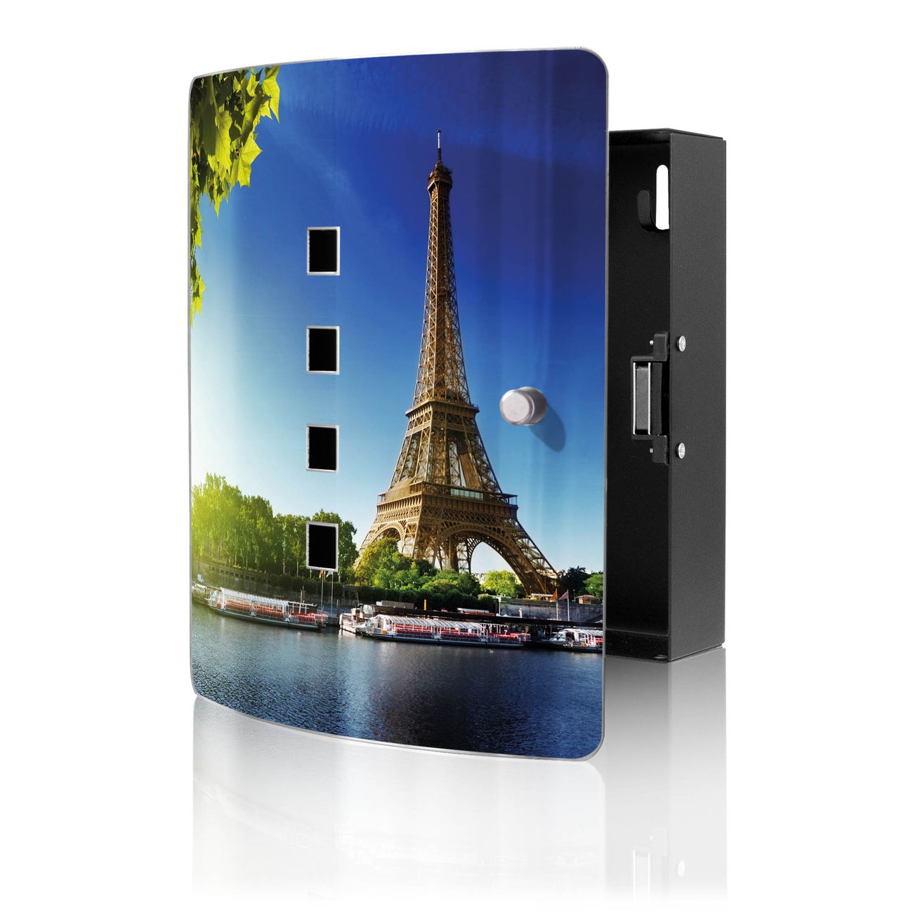 Funktion / Nutzen: Die leicht geschwungene Edelstahltür ist mit einer hochwertigen Motivfolie und dem Motiv Motiv Tour Eiffel kaschiert. Ein praktischer Magnetverschluss ermöglicht Ihnen ein schnelles Öffnen und Schließen. Befestigt wird der Schlüsselkasten an 2 Stellen auf der Rückseite, passendes Montagematerial fügen wir bereits bei.