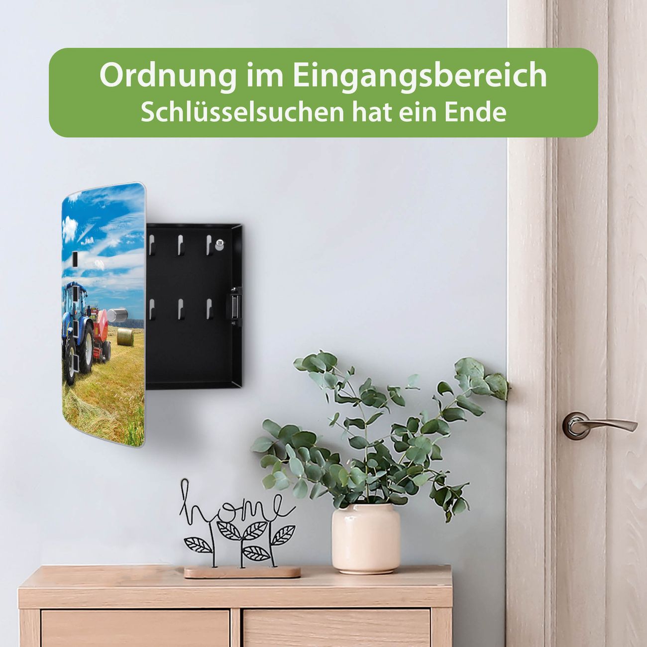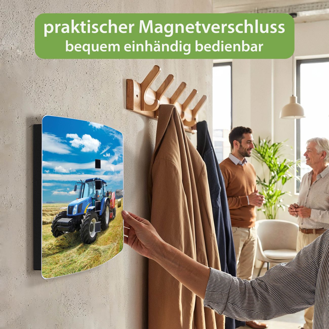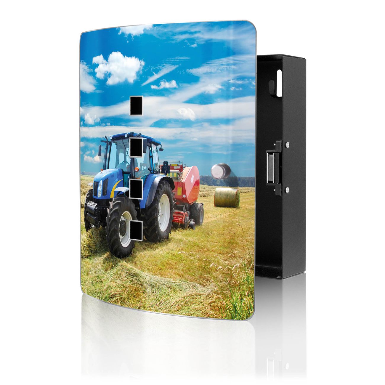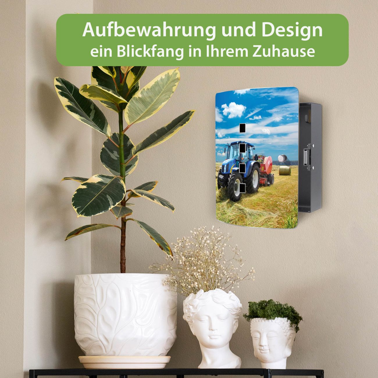 Funktion / Nutzen: Die leicht geschwungene Edelstahltür ist mit einer hochwertigen Motivfolie und dem Motiv Motiv Traktor kaschiert. Ein praktischer Magnetverschluss ermöglicht Ihnen ein schnelles Öffnen und Schließen. Befestigt wird der Schlüsselkasten an 2 Stellen auf der Rückseite, passendes Montagematerial fügen wir bereits bei.